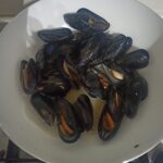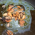Mano a mano che le cozze si aprono, mettetele in una ciotola, filtrate il liquido e tenetelo da parte. Appena si saranno raffreddate, sgusciatele, e mettetele in una ciotolina. In una capiente padella mettete una parte del liquido filtrato, e le cozze.