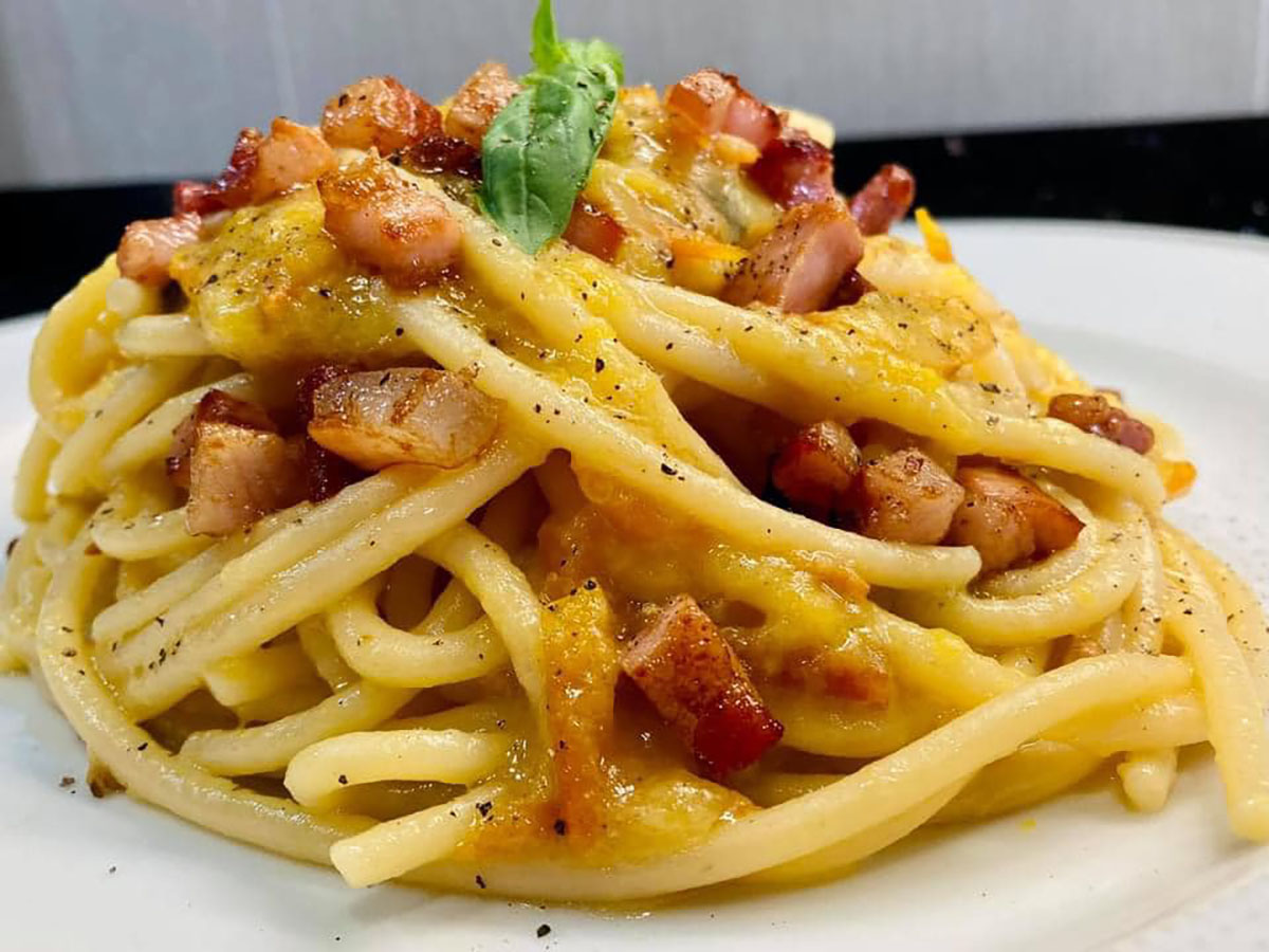 Gli spaghetti risottati all’amatriciana gialla con datterini gialli, guanciale e crema di pecorino sono una rivisitazione decisamente gourmet della classica amatriciana. La ricetta originale prevede l’utilizzo dei bucatini e nasce ad Amatrice, cittadina in provincia di Rieti. Ma anche passeggiando tra le vie della bellissima Roma, tra un Colosseo e una fontana di Trevi, potete sedervi e gustare questa prelibatezza. Oggi la vediamo in chiave completamente diversa, ma ne seguiamo ancora le regole base, come quella di non utilizzare gli odori per dare sapore al sughetto, non ne ha affatto bisogno.