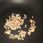 Iniziate a mettere sul fuoco, la pentola con l’acqua per cuocere la pasta. Nel frattempo che l’acqua raggiunga il bollore, tostate i pinoli in una capiente padella antiaderente, metteteli da parte.