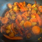 Dopo alcuni minuti aggiungiamo le patate tagliate a cubetti. Copriamo e cuociamo per circa 8 minuti Passati 8 minuti aggiungiamo l’aglio ben tritato e mescoliamo, poi il concentrato e mescoliamo continuamente per 1 minuto. Poi spolveriamo con la farina e mescoliamo continuamente finché tutta sciolta