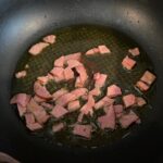 Riscaldiamo una padella, versiamo tre cucchiai di olio e quando ben caldo. Inseriamo e rosoliamo alcuni minuti la pancetta a fuoco medio