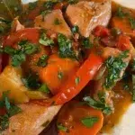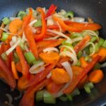Ritiriamo e lasciamo riposare in un piattino. Inseriamo nel fondo di cottura i pezzi di pollo e a fuoco vivace lasciamo che prendano colore. Rimuoviamo e lasciamo riposare in un piatto Intanto abbiamo tagliato la cipolla a fettine, la carota a rondelle, il sedano a rondelline e il peperone a listarelle Inseriamo le verdure nel fondo di cottura, le lasciamo appassire a fuoco medio, aggiungiamo un pizzico di sale e pepe e mescoliamo e cuociamo con coperchio a fuoco medio