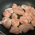 Tagliamo i petti di pollo a pezzi. Insaporiamo con sale e pepe quanto basta Tagliamo tre o quattro strisce di pancetta a cubetti
