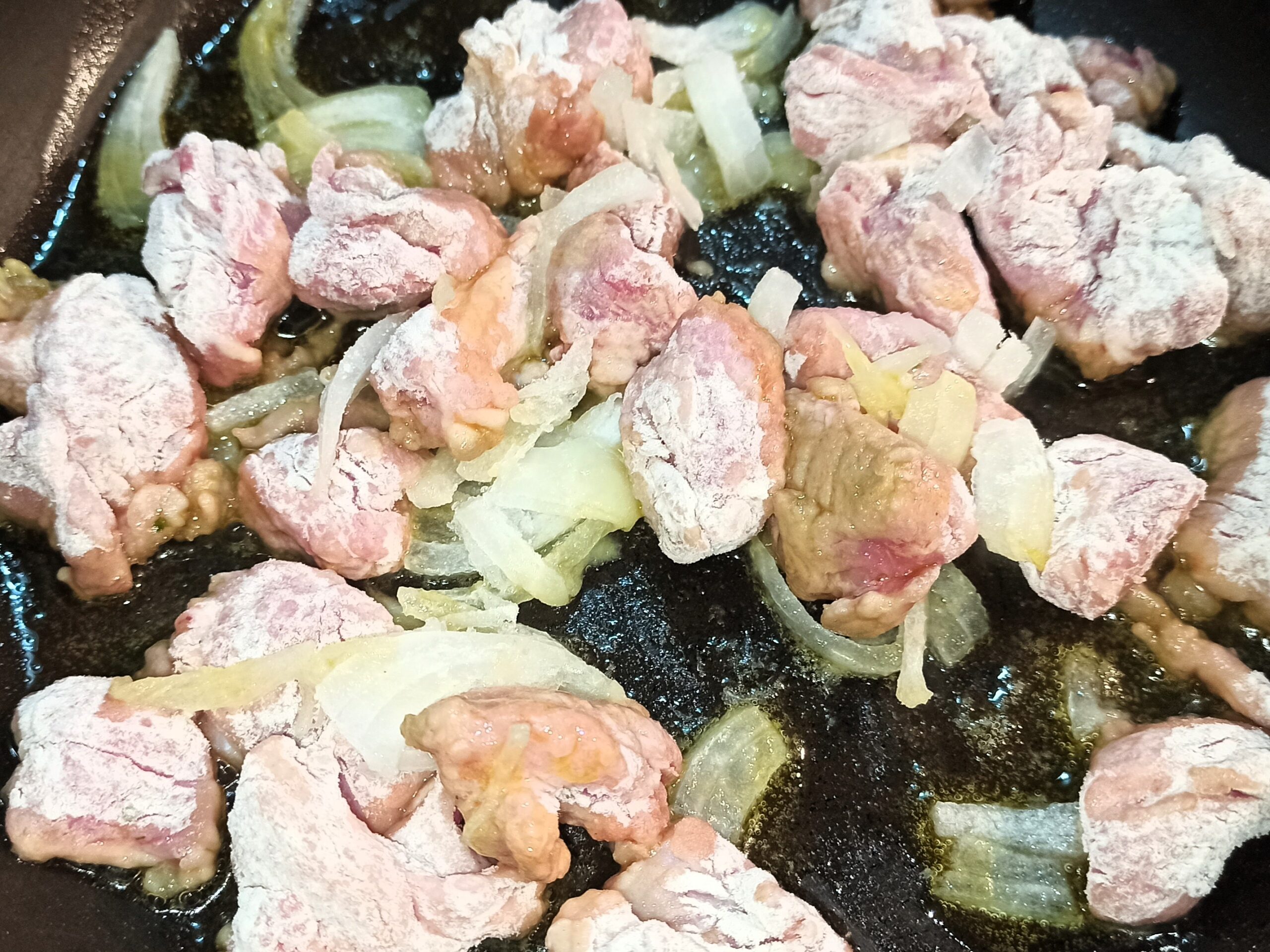 In una capiente padella mettete l’olio di semi di girasole, la cipolla tritata finemente, e i pezzetti di carne infarinata.