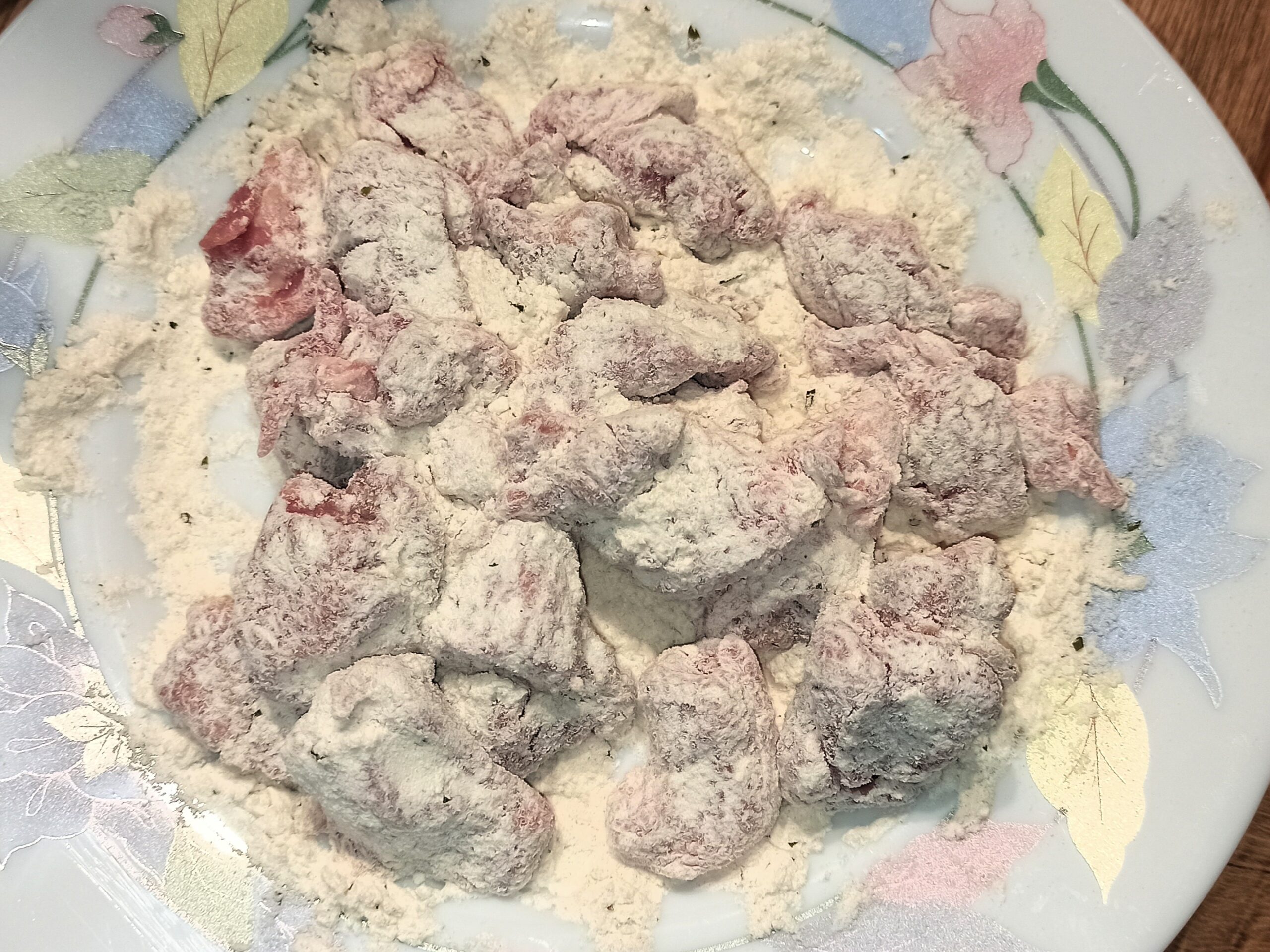 Tagliate la polpa di vitello in piccoli pezzetti, e passateli nella farina.