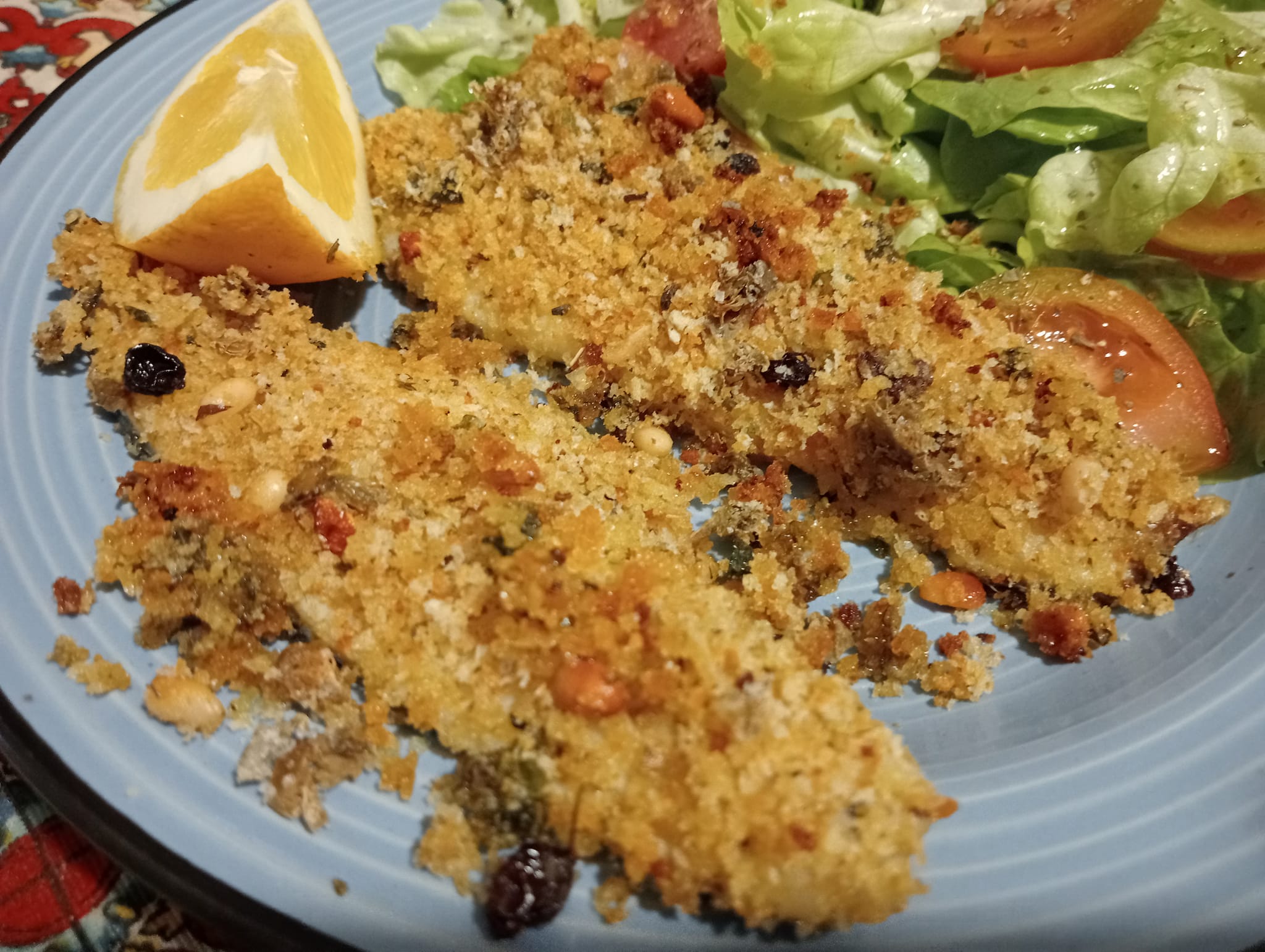 Mettete in una ciotola il pane raffermo grattugiato grossolanamente e le erbe aromatiche. Aggiungete un pizzico di origano, il sale, il pepe, un po’ di succo di limone e un filo di olio extravergine di oliva. Mescolate il tutto fino ad ottenere un composto soffice e sgranato. A questo punto, se vi piace, potete aggiungere anche un pizzico di pecorino alla panatura, come si fa per la cotoletta alla palermitana; e poi completate con dei capperi tritati finemente. Distribuite la panatura sul pesce, pressando in modo che aderisca perfettamente. Quando il pesce sarà ben ricoperto di panatura, irrorate ancora con un filo di olio e cuocete in forno già caldo a 200 gradi per 15 minuti. La vostra spigola alla palermitana è pronta.