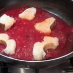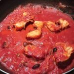 aggiungete anche le olive denocciolate e se occorre regolate di sale. Tagliate a pezzetti, della dimensione e forma che più preferite lo stoccafisso, ed aggiungetelo al sugo preparato.