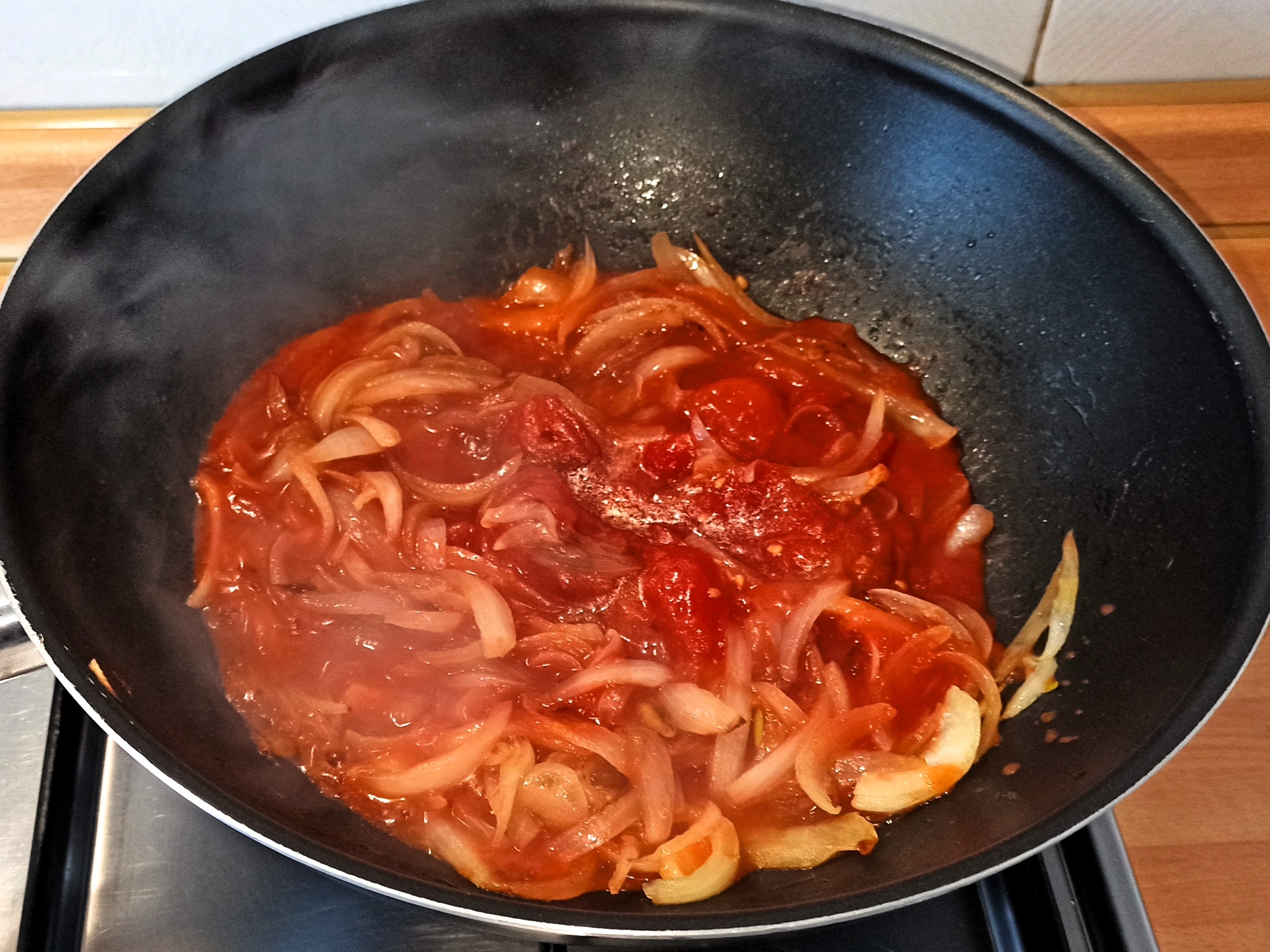 Appena iniziano ad appassire, sfumate con il vino bianco, poi aggiungete i pomodori pelati ed il concentrato.