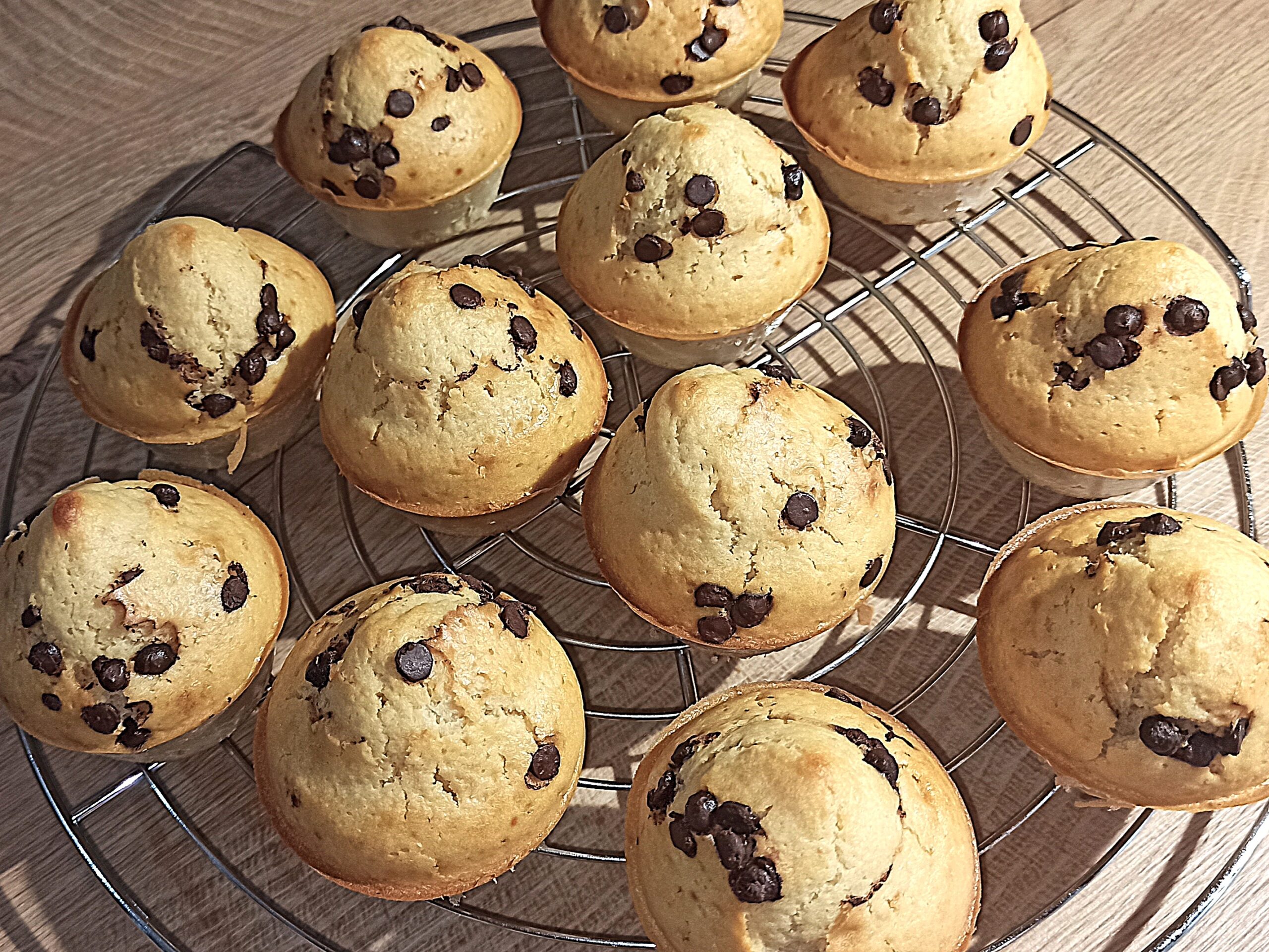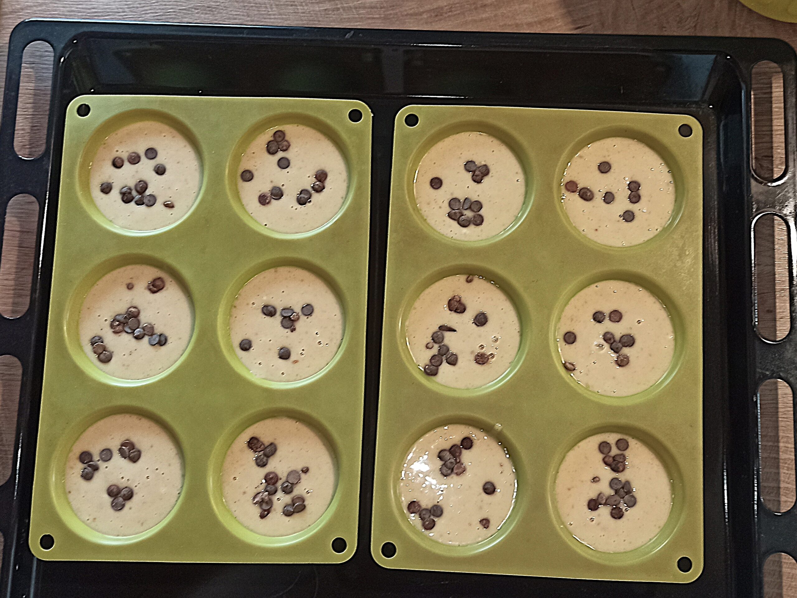 Verste il composto ottenuto negli stampini per muffin, oppure in altre formine che desiderate, completate cn le scaglie di cioccolato.
