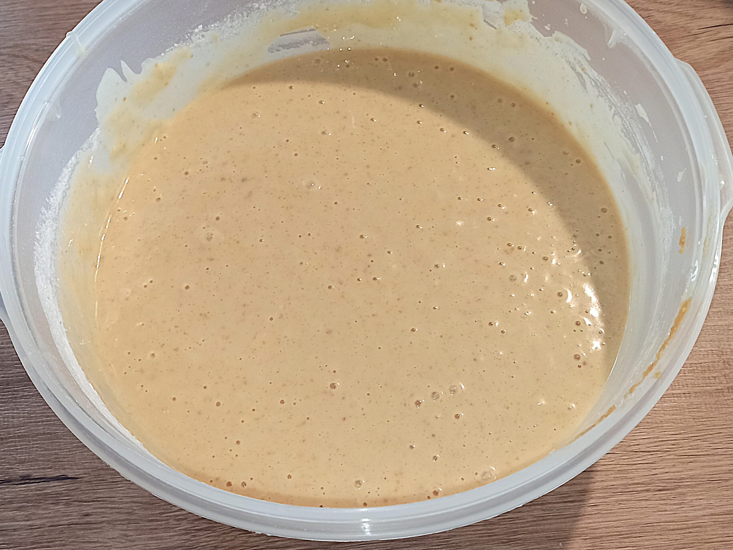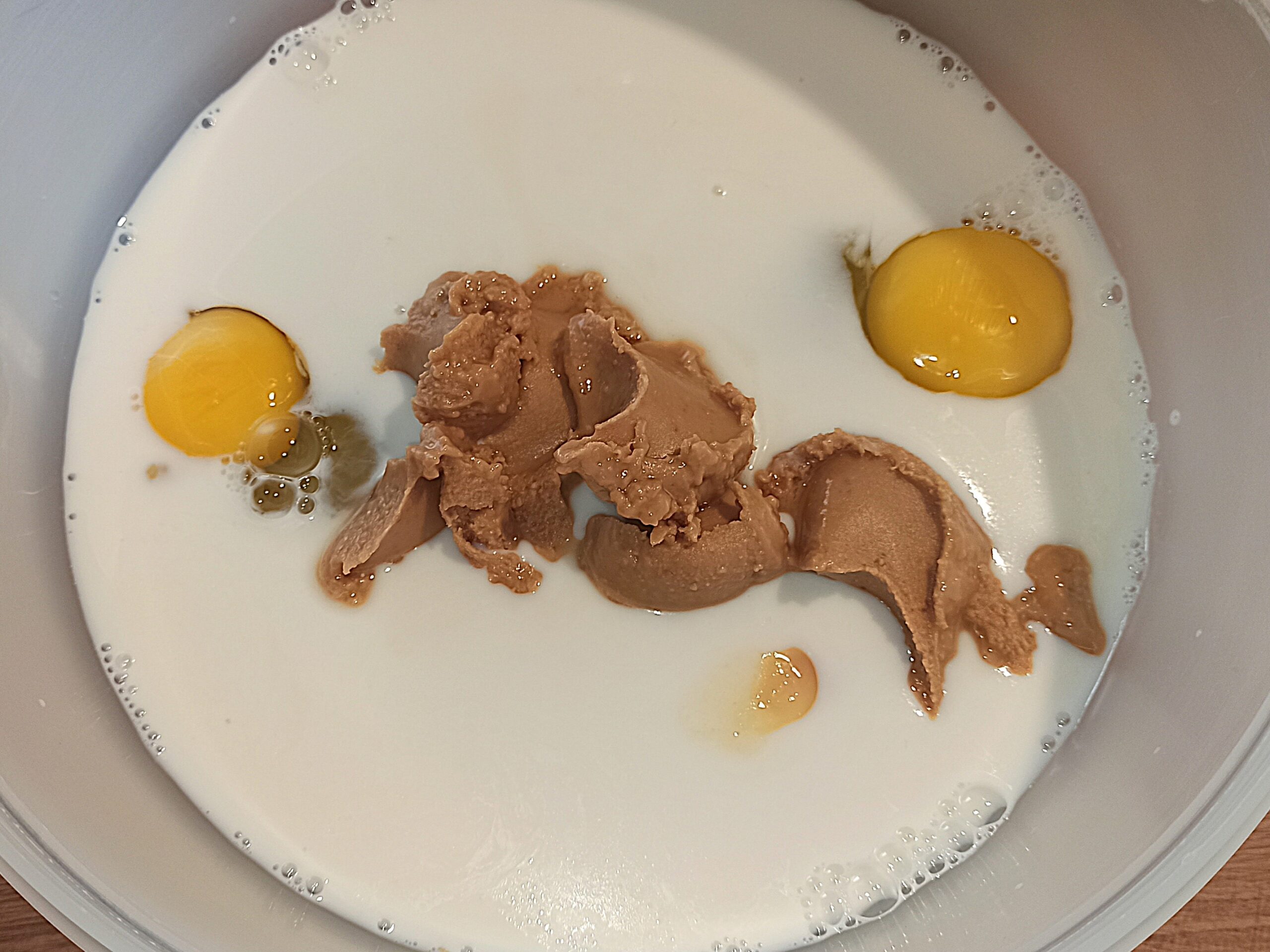In un’altra, mettete il latte, le uova, il miele, l’olio ed il burro di arachidi, mescolate con una frusta.
