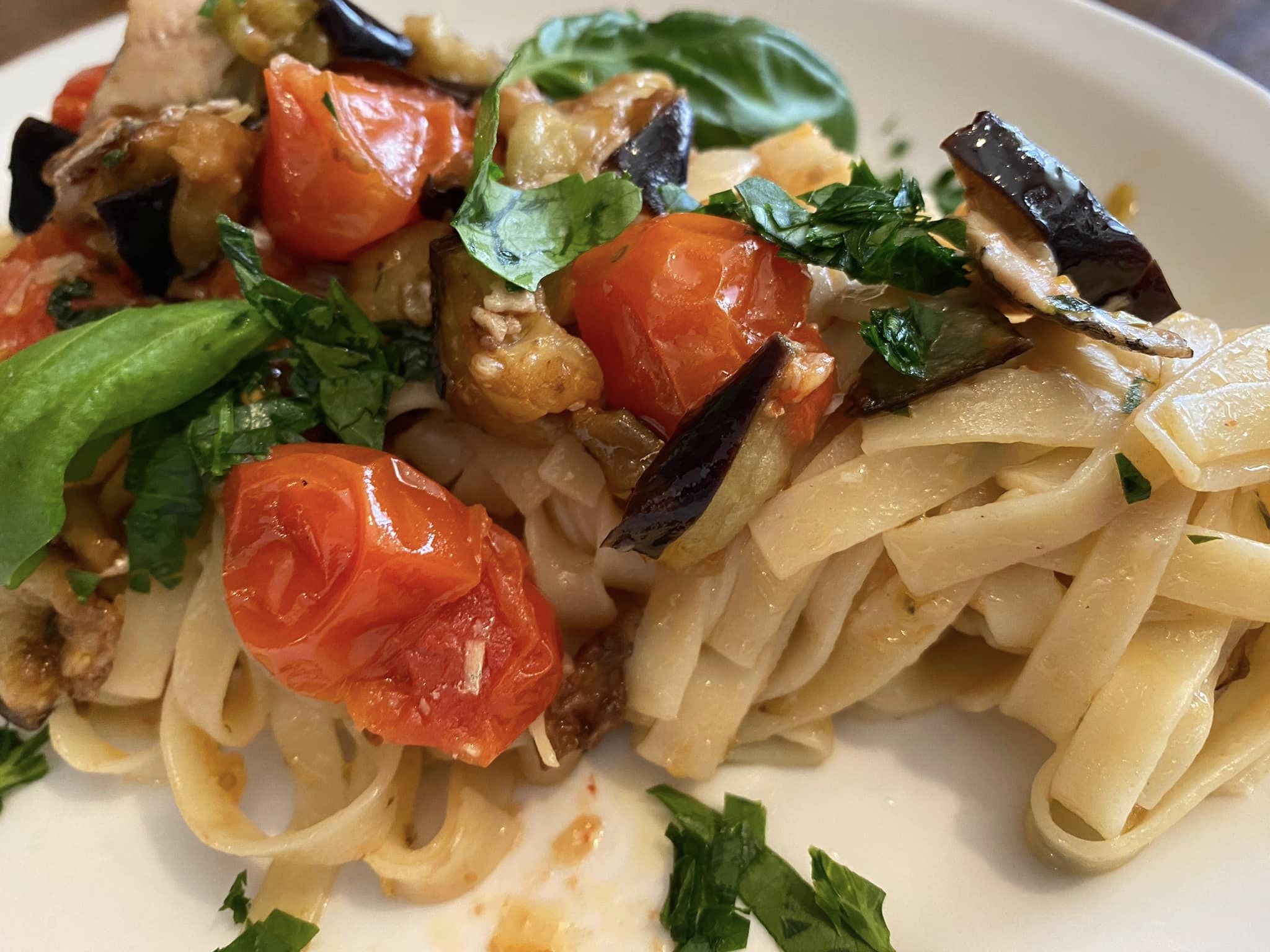 Intanto dopo aver pulito e lavato le alici, con una forbice da cucina le tagliamo a pezzettini e man mano le aggiungiamo in padella, grattugiamo delle scorze di limone, aggiungiamo il prezzemolo tagliato finemente, mentre il basilico lo inseriamo intero. Versiamo un filo d’acqua di cottura e cuociamo sempre a fiamma media. A questo punto le tagliatelle sono cotte al dente, le inseriamo in padella, non buttiamo l’acqua. Aggiungiamo i cubetti di melanzana, aggiustiamo di sale se necessario, ancora un filo d’acqua di cottura, saltiamo continuamente, amalgamiamo il tutto e finiamo la cottura in padella. Impiattiamo e buon appetito