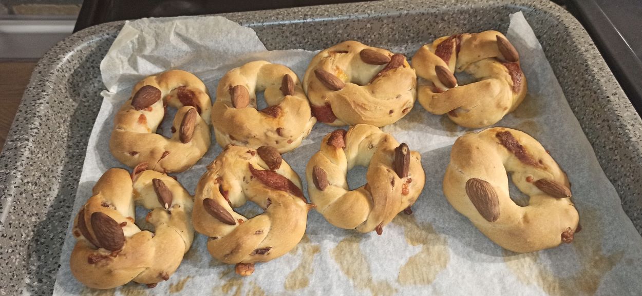 Trascorso questo ulteriore tempo di riposo, iniziate a formare i taralli. Prelevate un poco d’impasto, potete variare la quantità, secondo la grandezza, che vorrete dare ai vostri taralli. Formate due bastoncini ed intrecciateli fra di loro, (io ho intrecciato insieme anche delle fettine di salame) disponeteli su una leccarda, foderata con carta forno. Disponete su ogni tarallo due-3 mandorle.