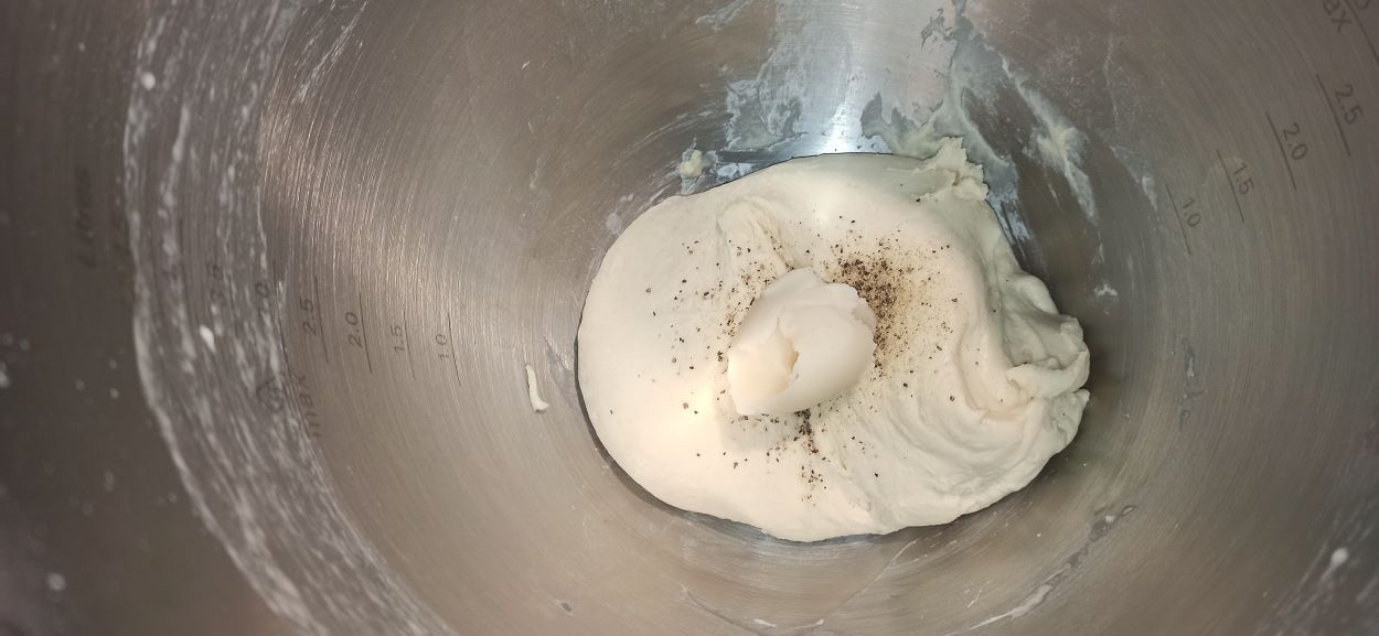 Trascorso il tempo di riposo, aggiungete lo strutto, il pepe, lavorate a velocità media.