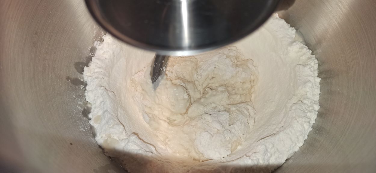 Montate la frusta a gancio, ed azionate a velocità bassa. Aggiungete poco alla volta l’acqua, il lievito e fate lavorare per cinque minuti, aggiungete anche il sale.