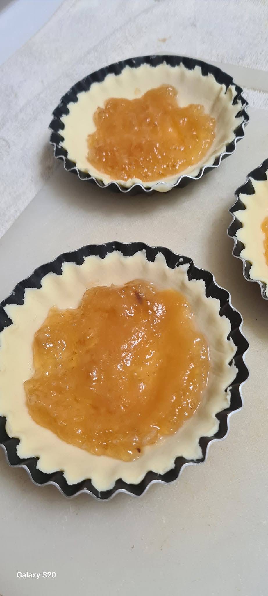 Per prima cosa, dato che è una ricetta molto veloce, prendiamo i nostri stampini per le crostatine. Adesso stendiamo su un piano la pasta sfoglia e tagliamo dei quadrati più o meno grandi quanto lo stampo. Fatto questo adagiamo la pasta sfoglia sugli stampini e tagliamo l’eccesso. Sul fondo della sfoglia aggiungiamo un cucchiaino di marmellata di albicocche o del gusto che preferite.