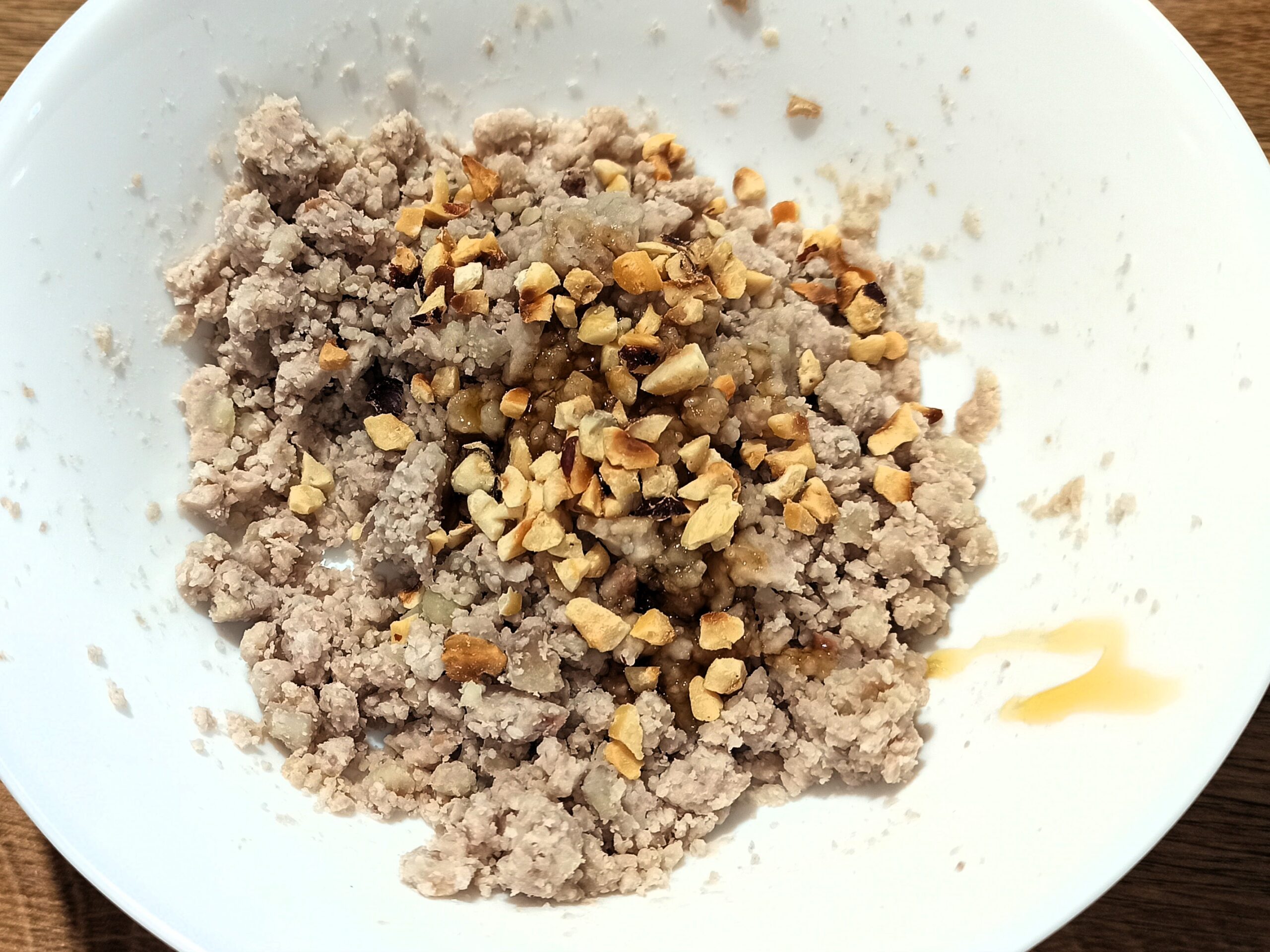 Aggiungete la granella di nocciola, il miele ed il rum, mescolate bene, fino ad ottenere un composto omogeneo.