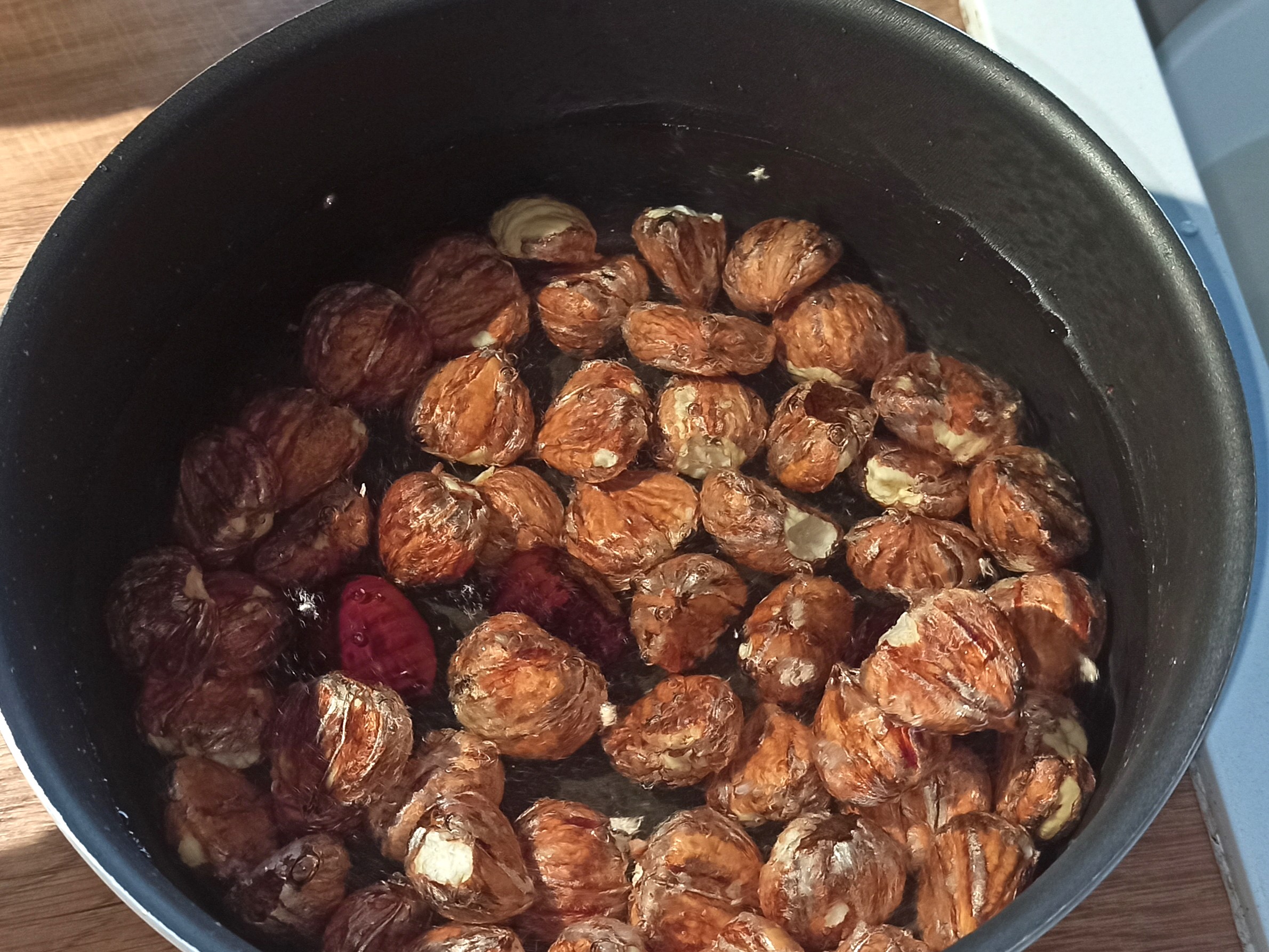 Lavare le castagne, eliminare la buccia e lessarle per venti minuti in acqua leggermente salata.