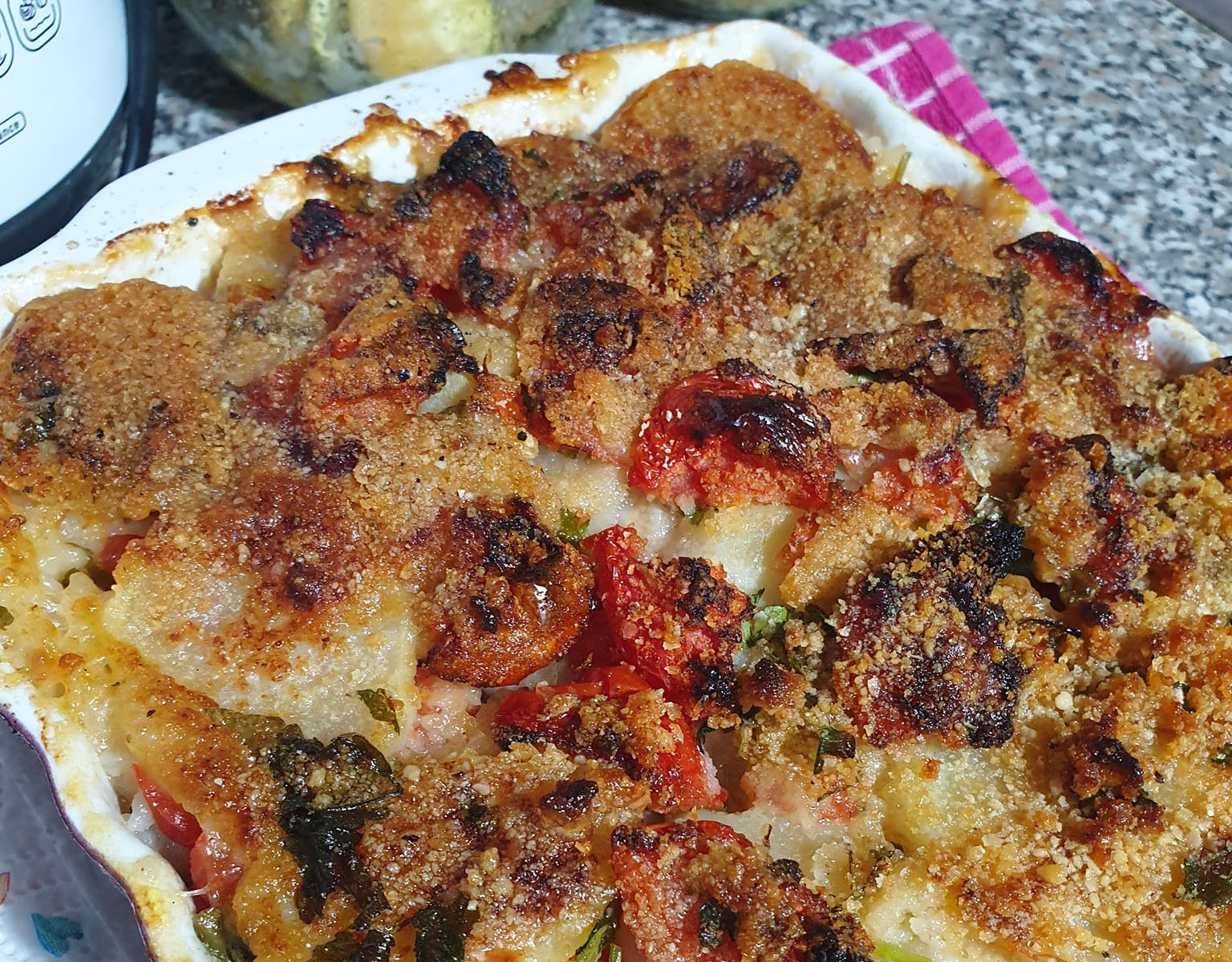 Sopra la cipolla disponete la metà delle patate, quindi metà zucchine e metà pomodori. Condite con altri due cucchiai di olio, l’aglio e un po’ di prezzemolo. Ora dovete posizionare metà riso e spolverarlo con metà pecorino e metà parmigiano. Coprite con la parte restante di zucchine e pomodori e versate altri due cucchiai di olio e il prezzemolo. Aggiungete le patate, il riso, completate con i formaggi e il pangrattato. Un filo di olio e versate l’acqua salata con i 6 grammi di sale. Coprite con carta forno e fate cuocere a 180 gradi per 40 minuti. Rimuovete la carta forno e fate cuocere a forno ventilato per altri 10 minuti. La vostra tiella di riso con patate e zucchine è pronta. Buon appetito.