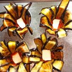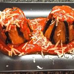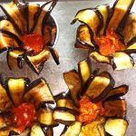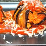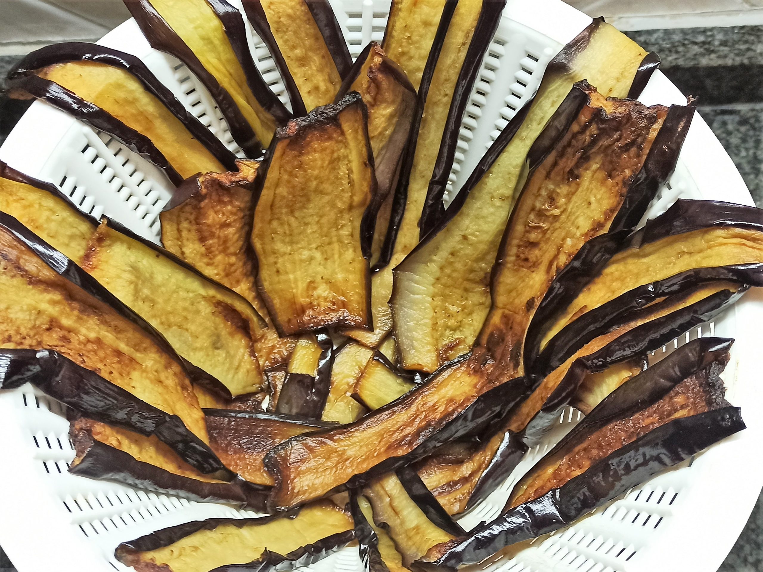 Nel frattempo lavate le melanzane, eliminate la parte del picciolo, e tagliatecele nel senso della lunghezza, per uno spessore di 5 millimetri. Friggetele in olio evo preriscaldato a 170°, appena risulteranno dorate, scolatele su un vassoio con carta assorbente, tamponatele e posizionate in un colapasta e/o un cestino forato, in modo da far eliminare ancora l’olio in eccesso. Potete friggere le melanzane anche con grande anticipo, in modo da lasciarle asciugare per più tempo.
