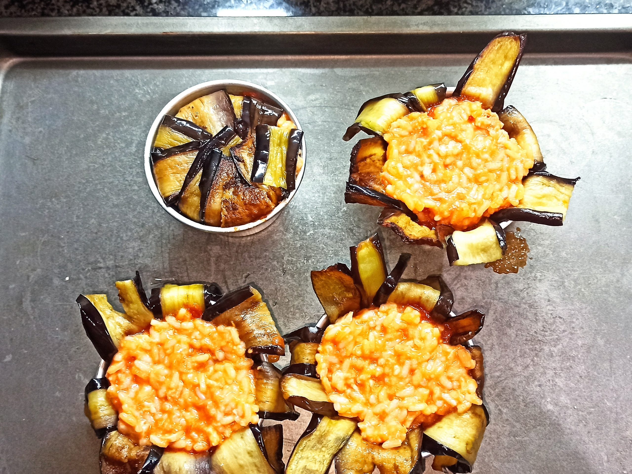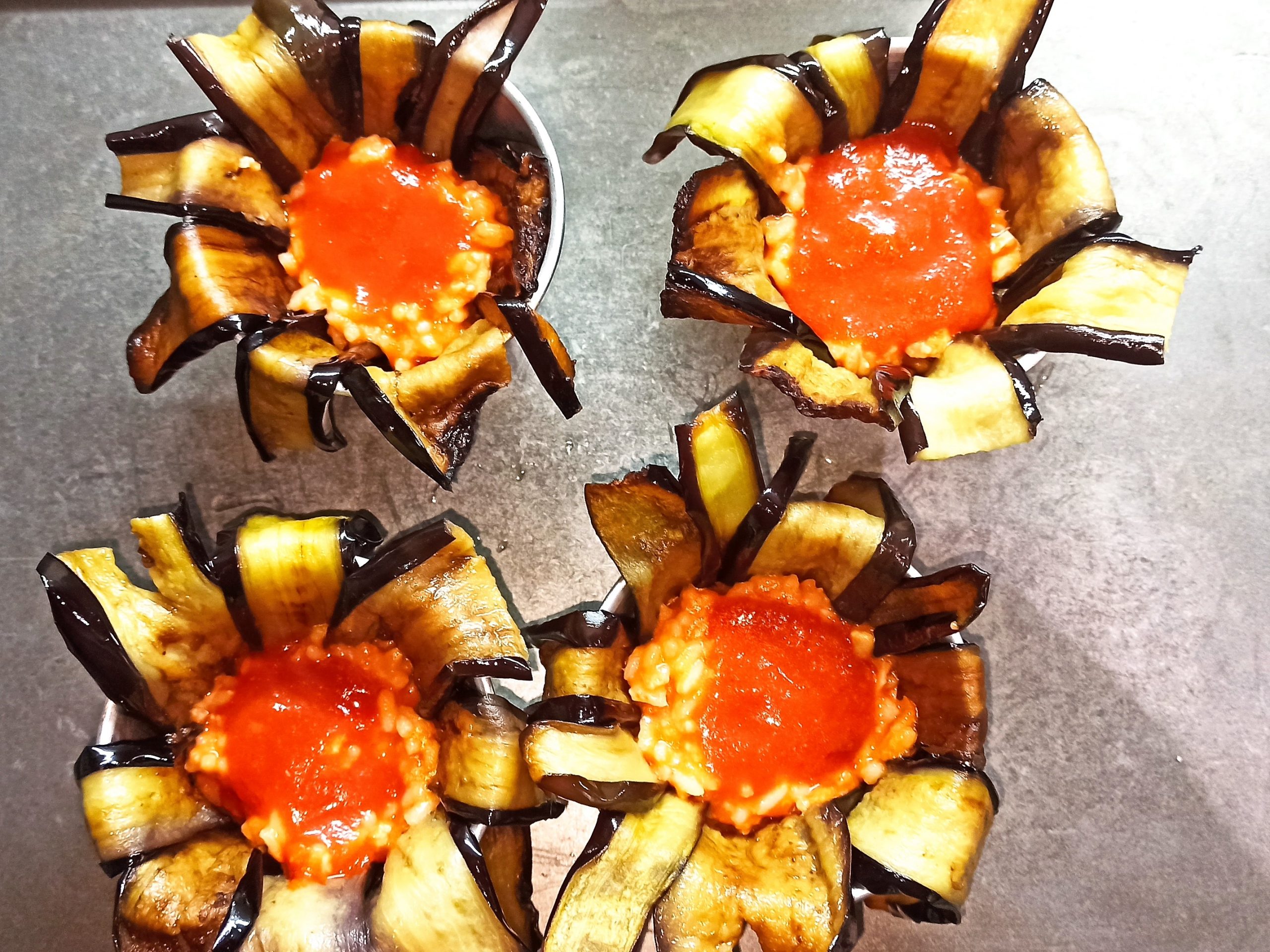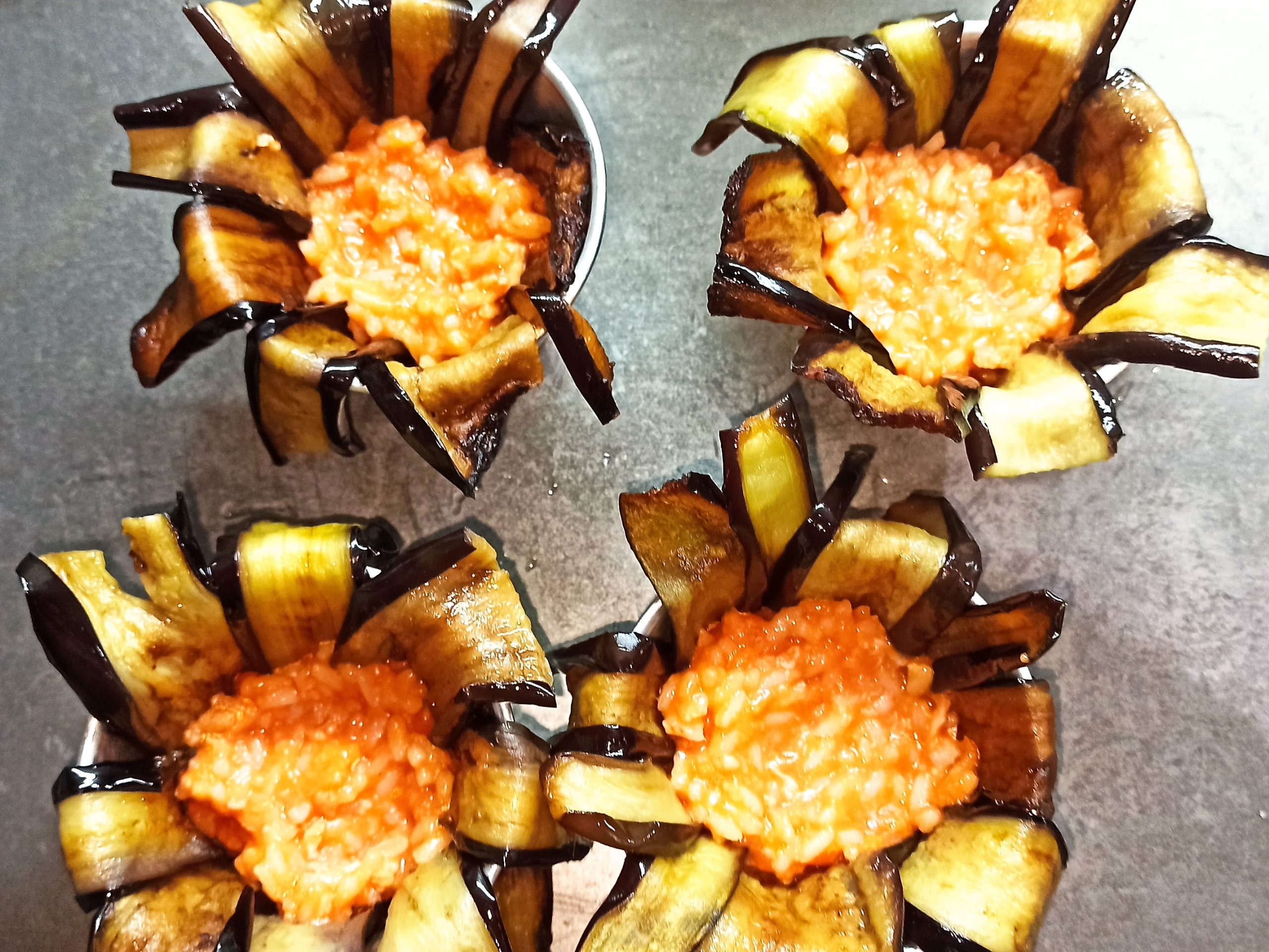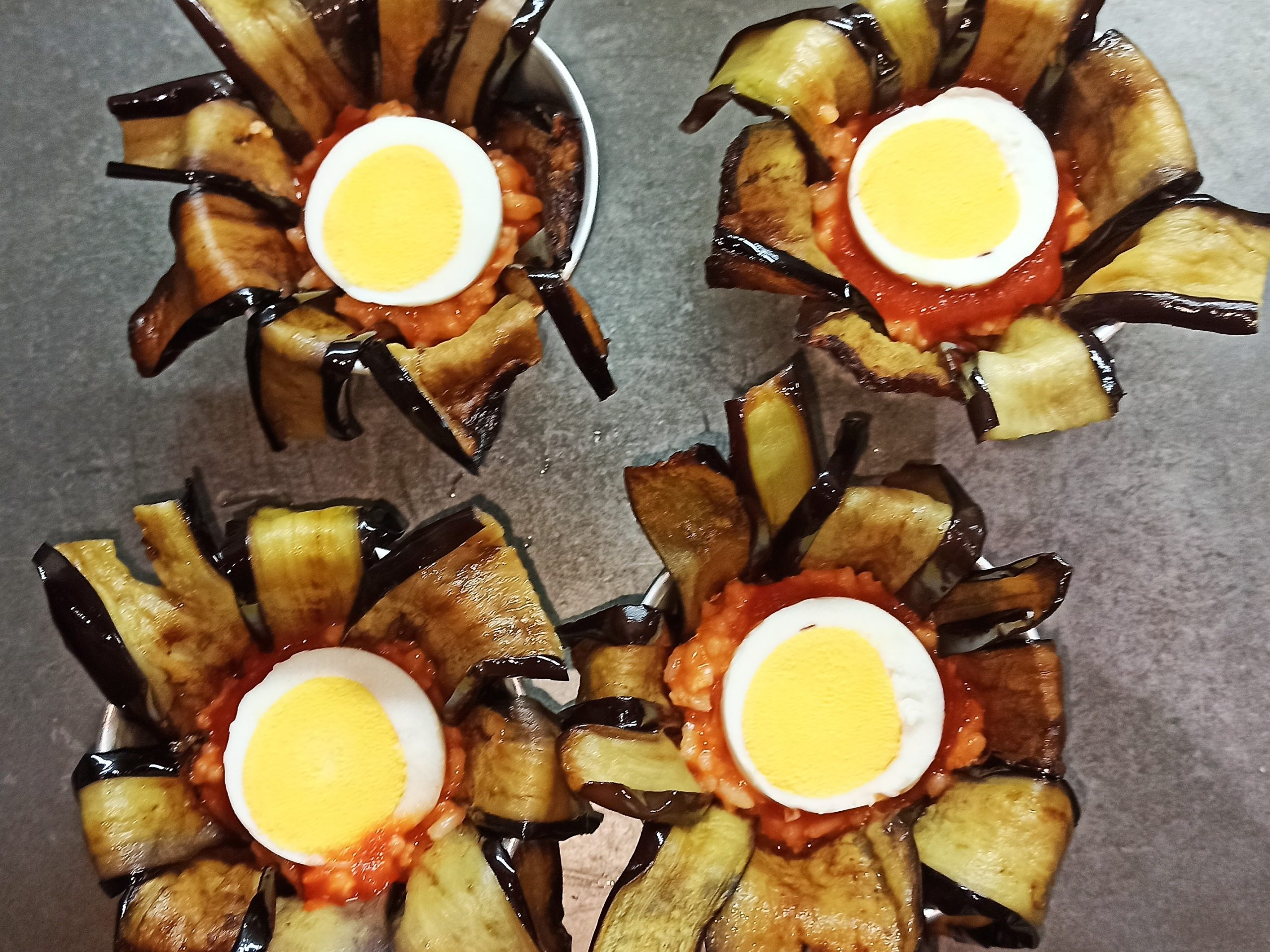 Posizionate un cucchiaio di ragù sul fondo degli stampini e rivestiteli con le melanzane. Sul fondo del rivestimento di melanzane, posizionate un poco di ragù e un pezzetto di mozzarella, poi il riso fino a metà dello stampino e unite ancora un poco di ragù. Sbucciate e tagliate l’uovo sodo a fette, aiutandovi con l’apposito attrezzo, posizionate in ogni stampino una fetta d’uovo, ricoprite con altro ragù e con il riso, fino a totale riempimento.