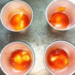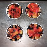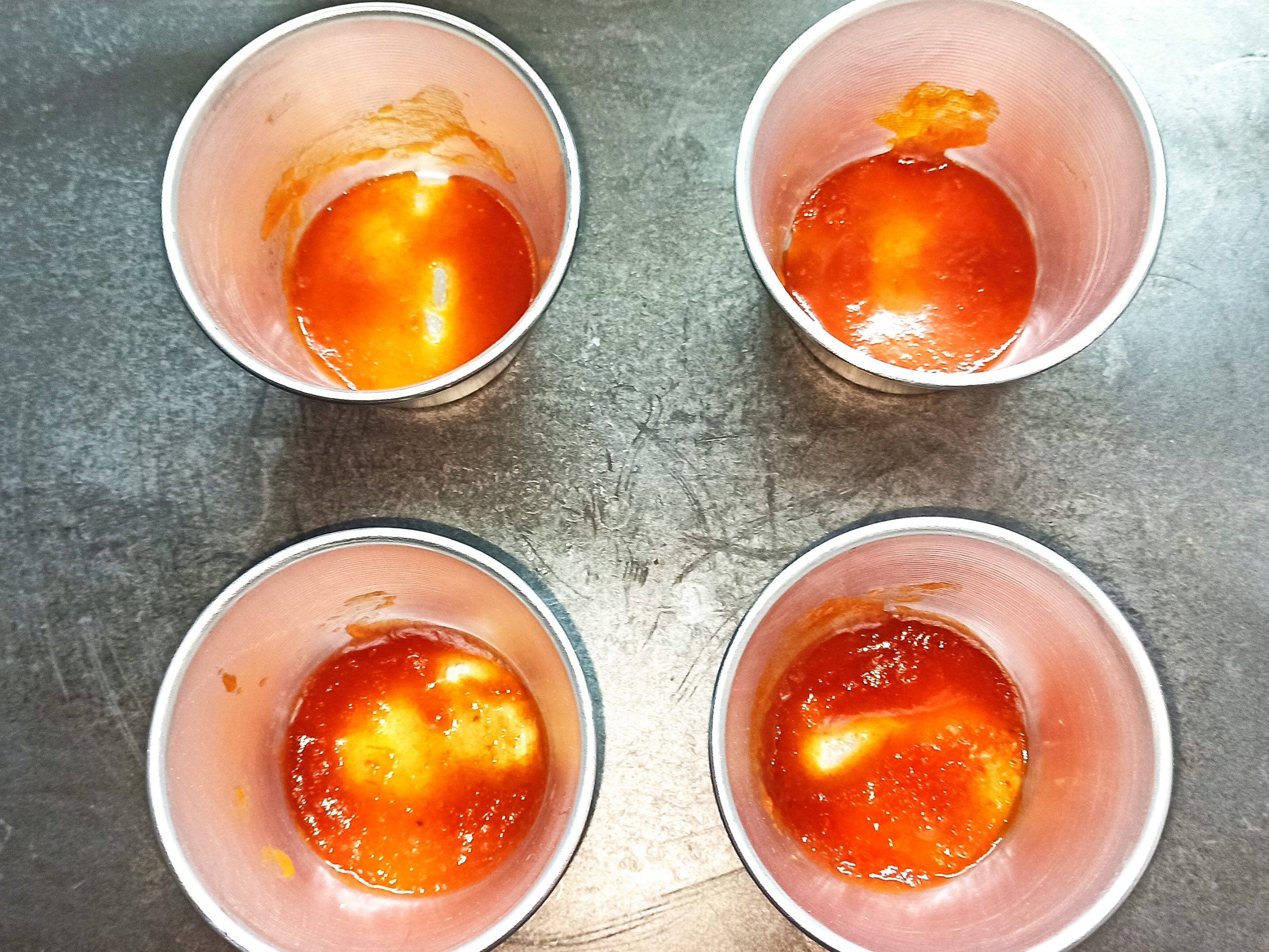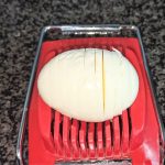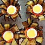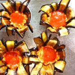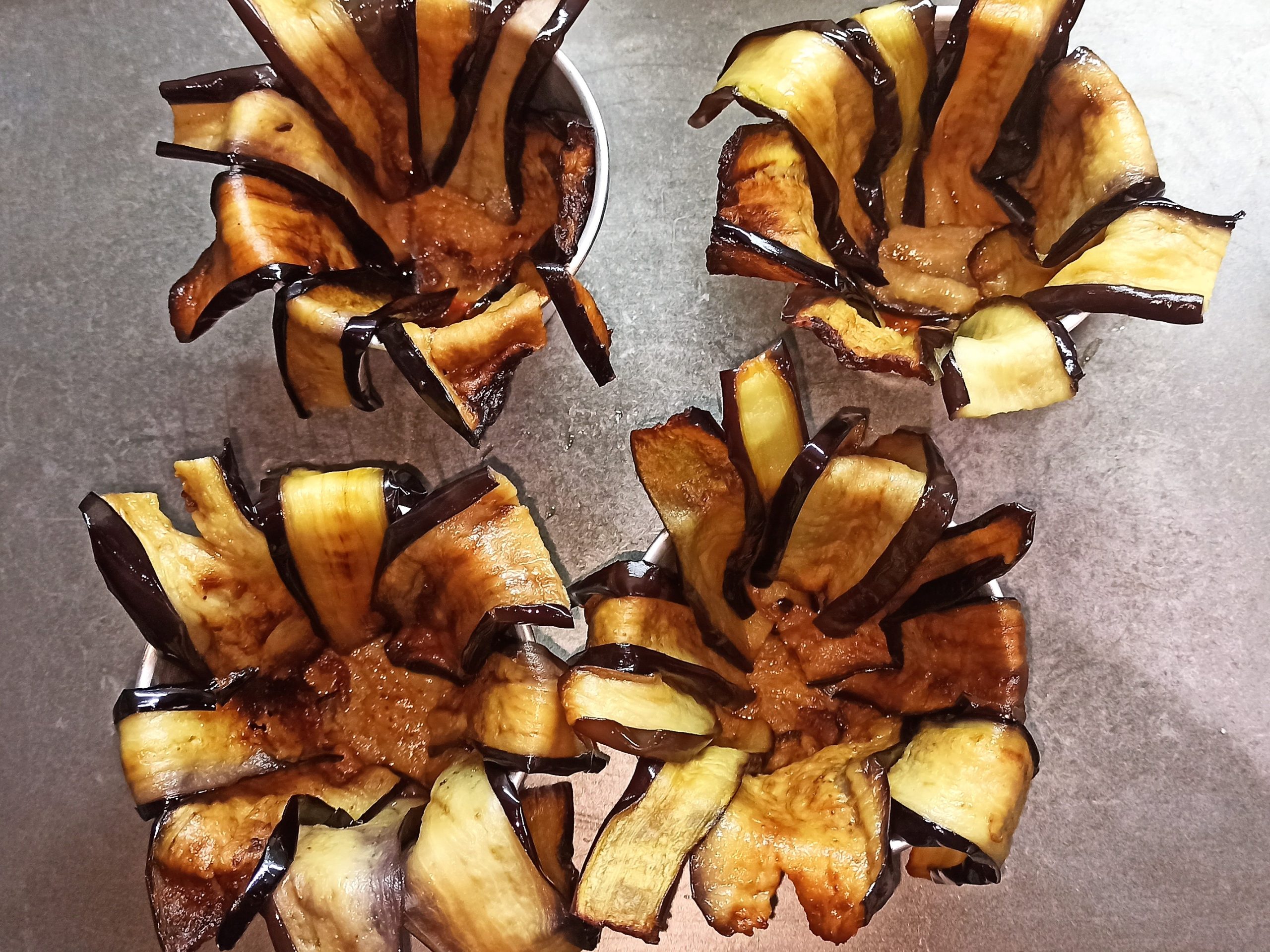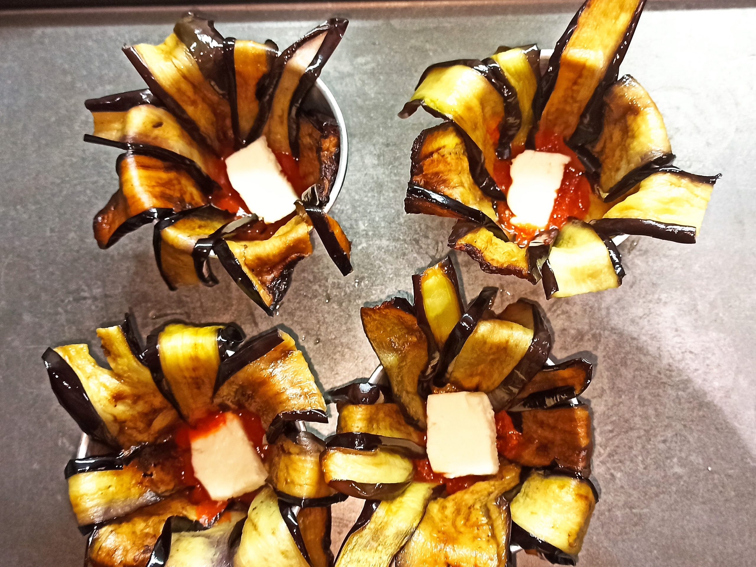 Posizionate un cucchiaio di ragù sul fondo degli stampini e rivestiteli con le melanzane. Sul fondo del rivestimento di melanzane, posizionate un poco di ragù e un pezzetto di mozzarella, poi il riso fino a metà dello stampino e unite ancora un poco di ragù. Sbucciate e tagliate l’uovo sodo a fette, aiutandovi con l’apposito attrezzo, posizionate in ogni stampino una fetta d’uovo, ricoprite con altro ragù e con il riso, fino a totale riempimento.