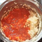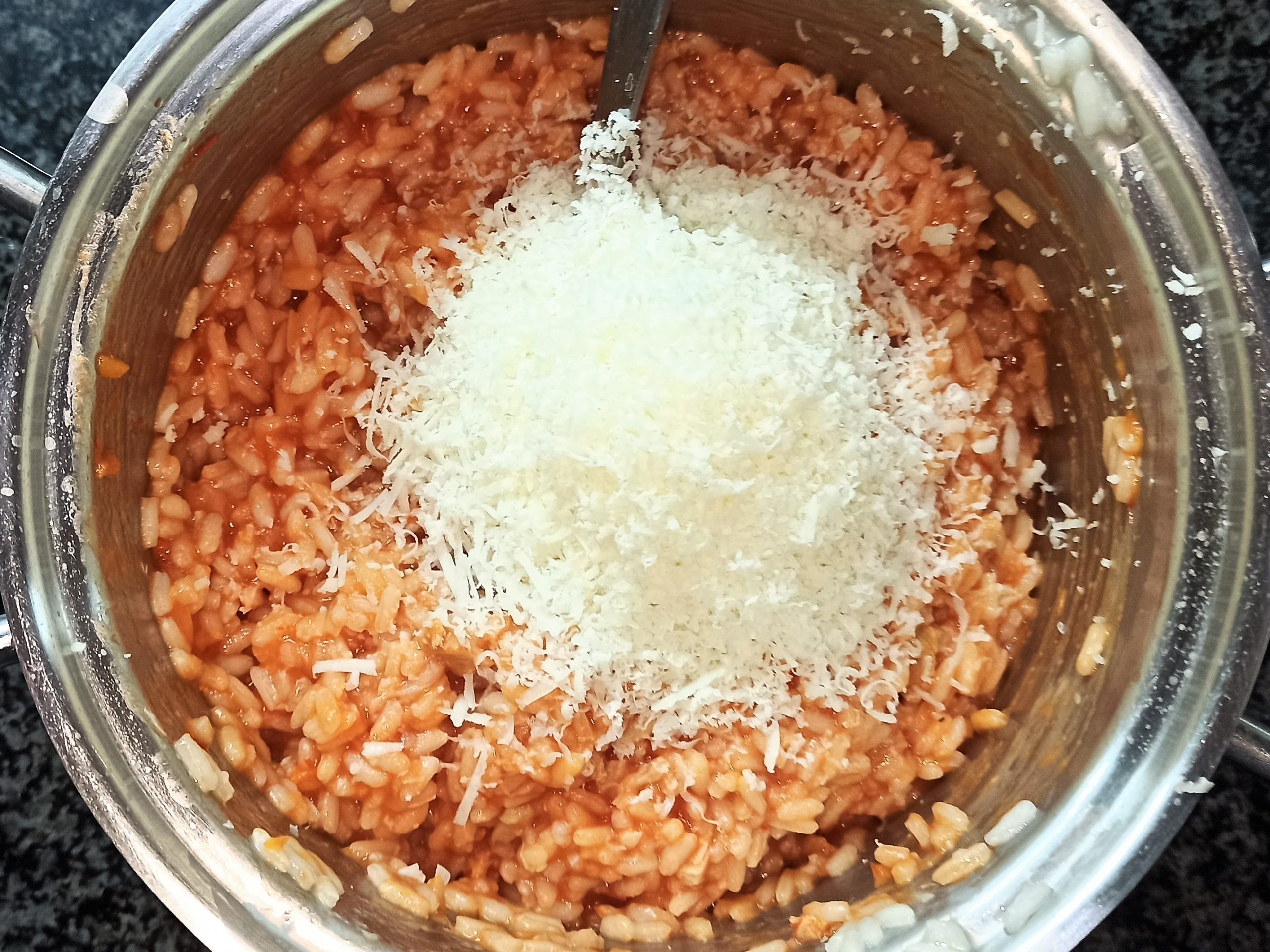 Nel frattempo il ragù sarà cotto, regolate di sale e profumate con foglioline di basilico spezzettate. Cuocete il riso in abbondante acqua leggermente salata, colatelo bene, ponetelo nuovamente nella pentola di cottura, unite il ragù e mescolate bene, poi il pecorino grattugiato, mescolate ancora.