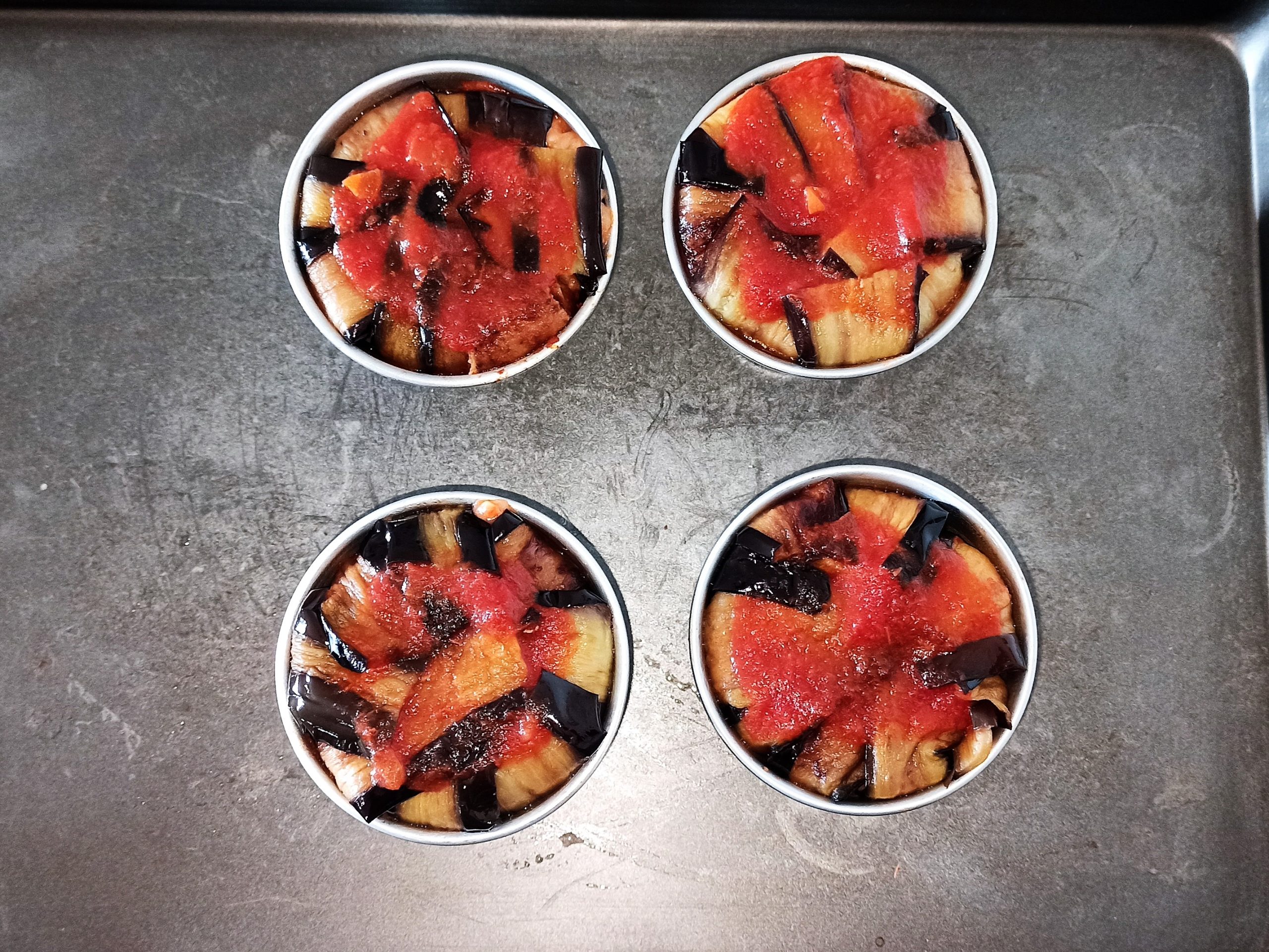 Chiudete i vostri timballetti con le melanzane, terminate con il ragù. Cuocete in forno preriscaldato a 200° per quindici minuti. Sfornate, sformate i vostri timballetti facendo molta attenzione a non scottarvi. Posizionate sul fondo del piatto da portata un poco di ragù, posizionate sopra i timballetti, completando il piatto con pecorino grattugiato.