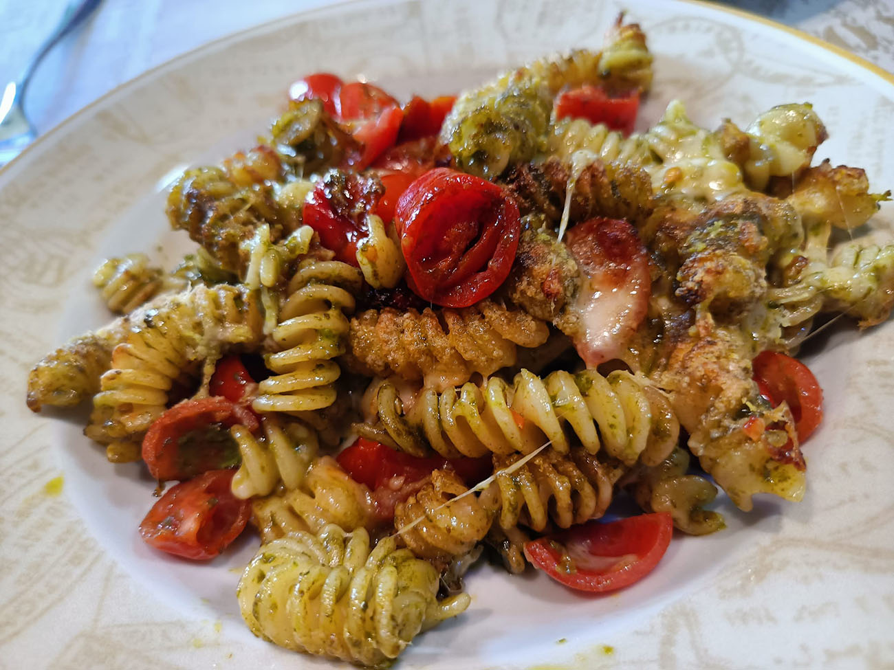 Timballo di pasta con pomodori gratinati al pesto e Castelmagno