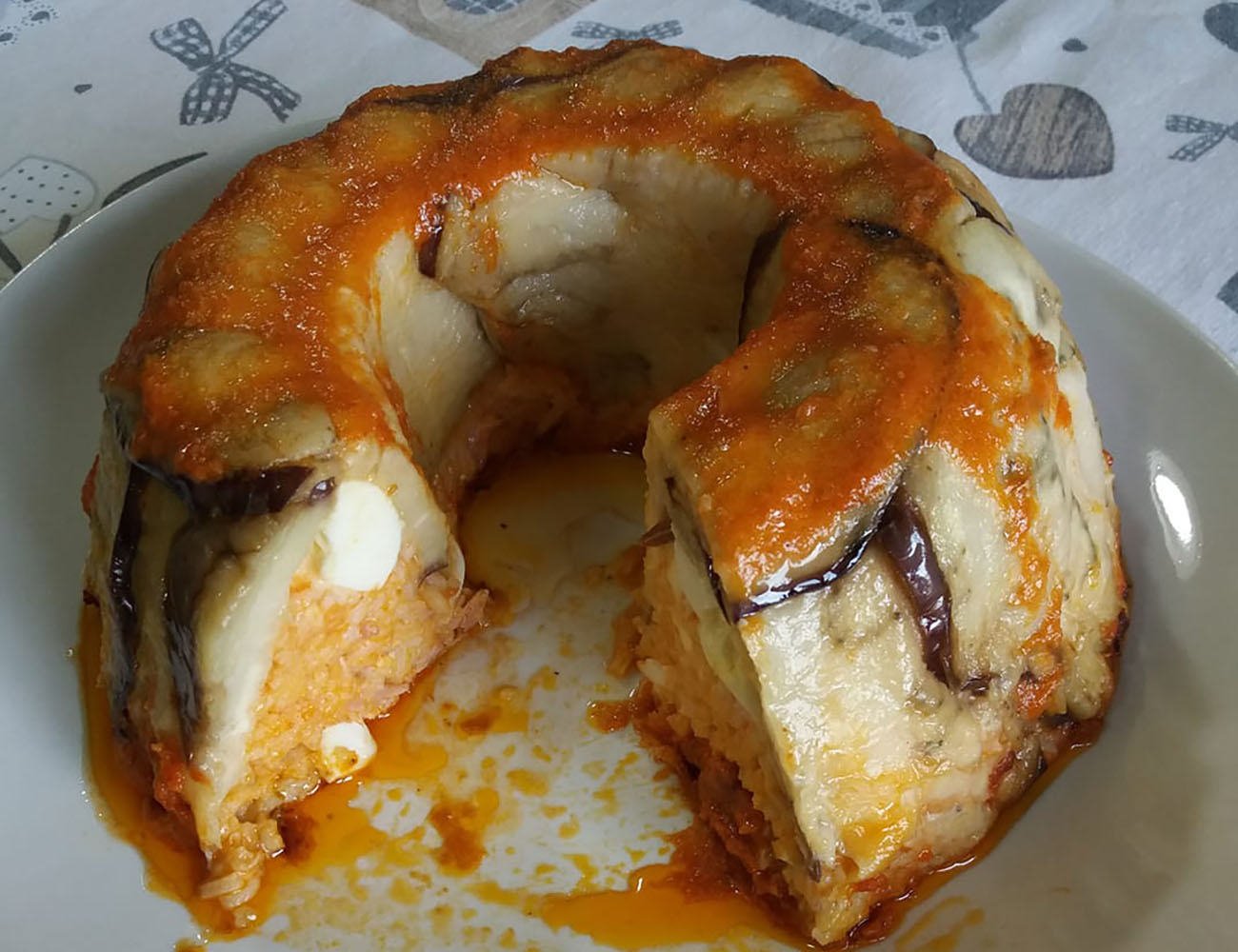 Disponete alla base le melanzane tagliate a fette. Ricoprite con foglie di basilico. Versate la metà del riso, quindi la mozzarella a tocchetti, poi l’altra metà del riso. Completate con i 4 cucchiai di salsa e un’altra spolverata di parmigiano. Cuocete a 200 gradi per 40 minuti. Lasciate raffreddare un po’ prima di capovolgere. Il vostro timballo di riso alla parmigiana è pronto. Leggi anche: Timballo del Gattopardo, La pasta al forno siciliana più buona che ci sia. La vera ricetta dell’antica tradizione