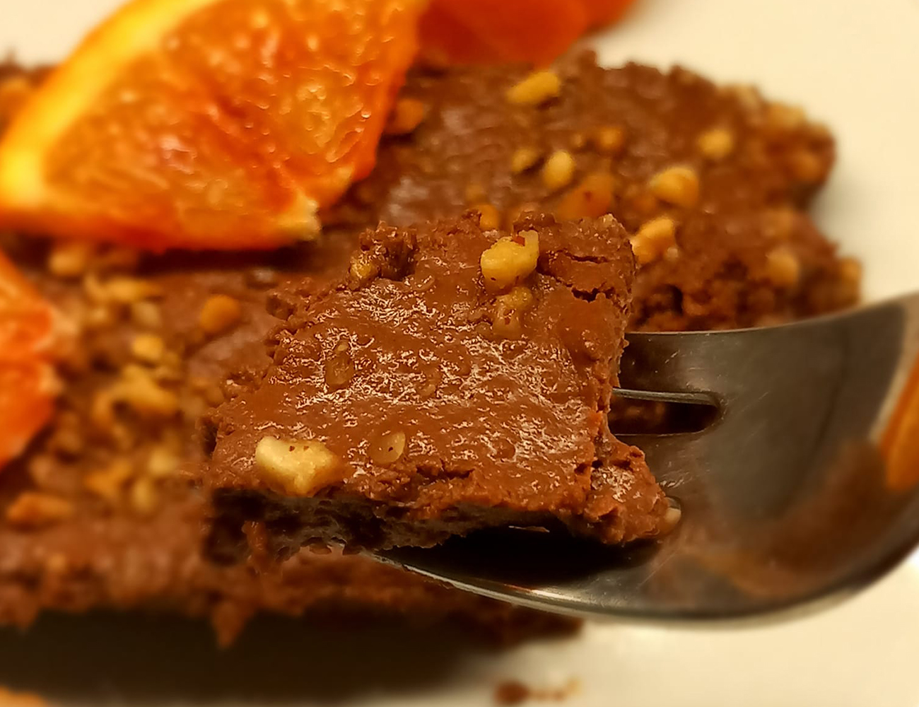 Mixate il tutto finchè non diventerà una crema liscia.Versare in una tortiera spennellata con pochissimo olio oppure ricoperta di carta forno. Mettere in frigo per 4/5 ore o meglio ancora per tutta la notte. Una volta fredda decorate a vostro piacimento, anche se devo ammettere che la granella di nocciola tostata e Ie rondelline di arancia ci stanno benissimo. Affettare e assaggiare, sarà una goduria. QUesta torta può essere conservata in frigo anche 3, 4 giorni ma siamo sicuri finirà subito.