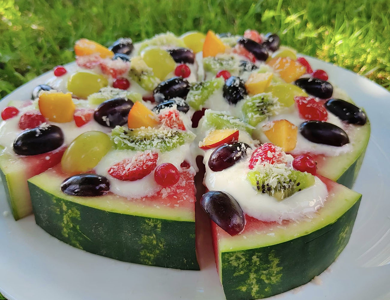 Per iniziare a preparare la pizza cocomero, prendete una fetta di anguria spessa circa 2,5 cm e tagliatela in otto spicchi, proprio come fareste con una pizza. Disponete gli spicchi su un piatto grande. A questo punto, spalmate su ciascuno spicchio una generosa quantità di yogurt greco. Lo yogurt non solo aggiunge una piacevole cremosità, ma anche un contrasto di sapori leggermente acido che si sposa alla perfezione con la dolcezza dell’anguria. Ora è il momento di divertirsi con la decorazione: utilizzate frutta fresca di stagione come fragole, mirtilli, kiwi, pesche o qualsiasi altra frutta che preferite.