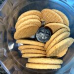 Per preparare la torta di nonna Carmela, iniziate a mettere i biscotti nel bicchiere del mixer e tritateli finemente.