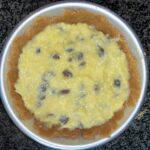 Imburrate una teglia tonda di 22 centimetri di diametro, foderatela con 3/4 di impasto. Mescolate le gocce di cioccolato alla crema pasticcera, e versatela all’interno della ciotola, livellate bene,