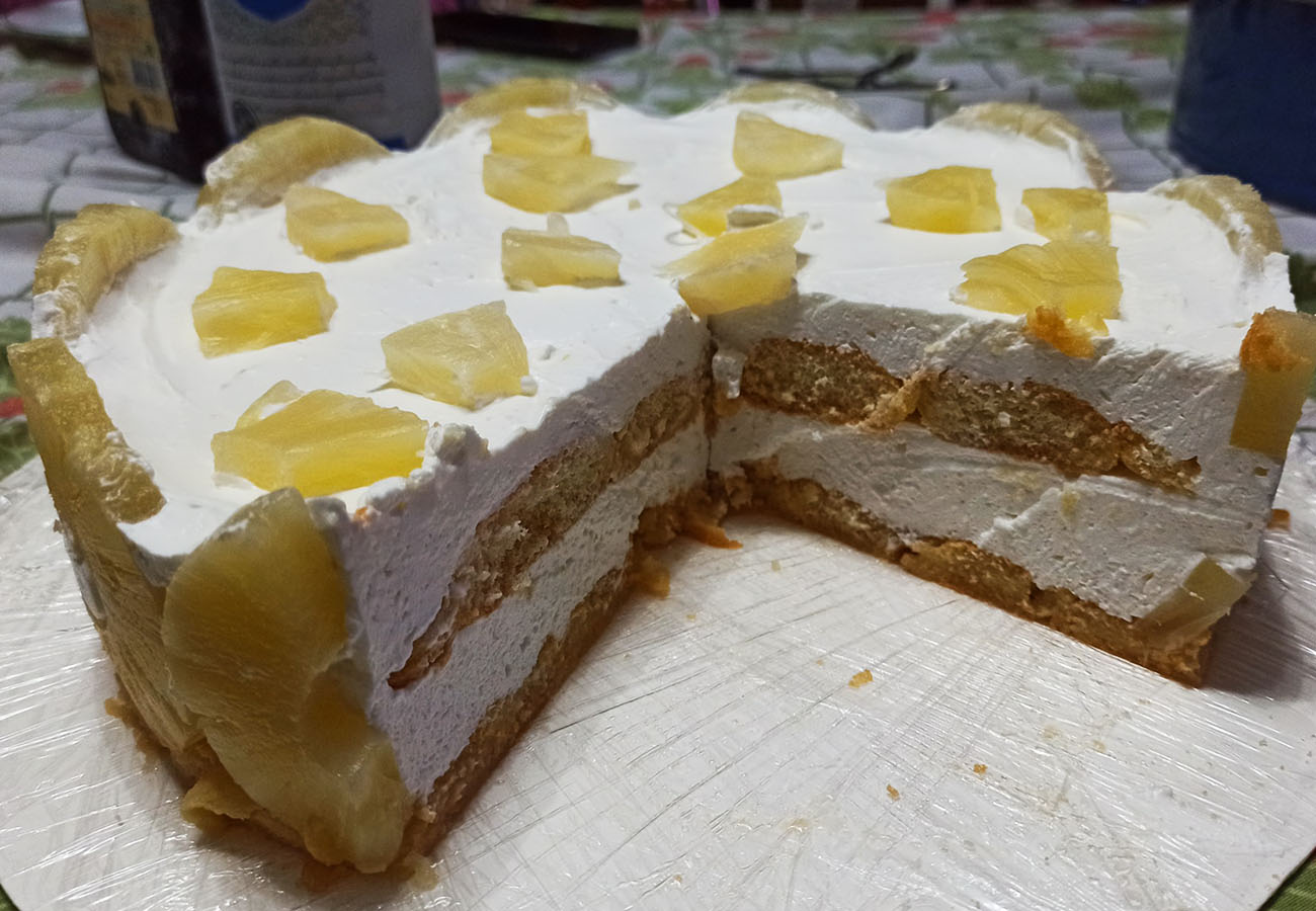 Versate la crema sulla base di savoiardi e livellate bene la superficie. Decorate la torta con le fette di ananas rimaste, tagliandole a metà per ottenere degli spicchi da disporre in cerchio sulla superficie, e ponete al centro una fetta intera per un effetto scenografico. Lasciate riposare la torta in frigorifero per almeno 4 ore, oppure in freezer per 2 ore. Una volta pronta, rimuovete delicatamente l’anello della tortiera e servite la vostra torta fredda yogurt e ananas. Buon appetito!