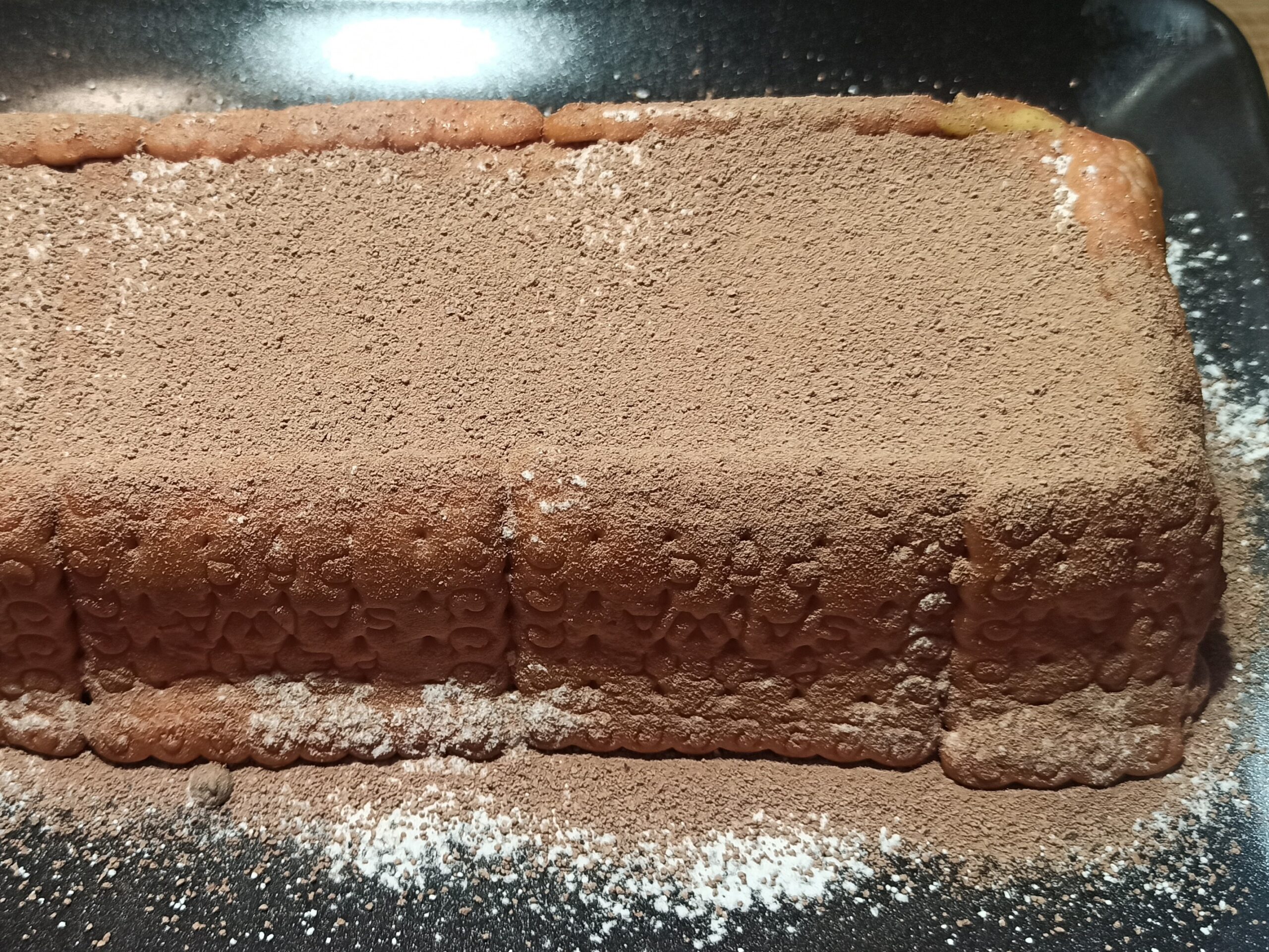 Trascorso questo tempo, aprite la pellicola, sformate la torta sul un piatto da portata, e rimuovete delicatamente la pellicola. Spolverizzate la superfice con il cacao amaro, servite e gustate.