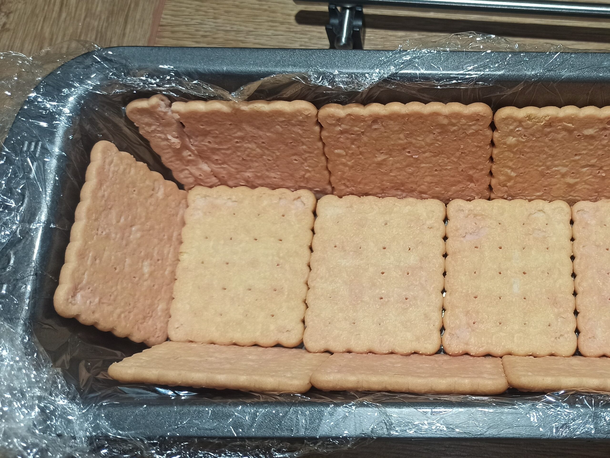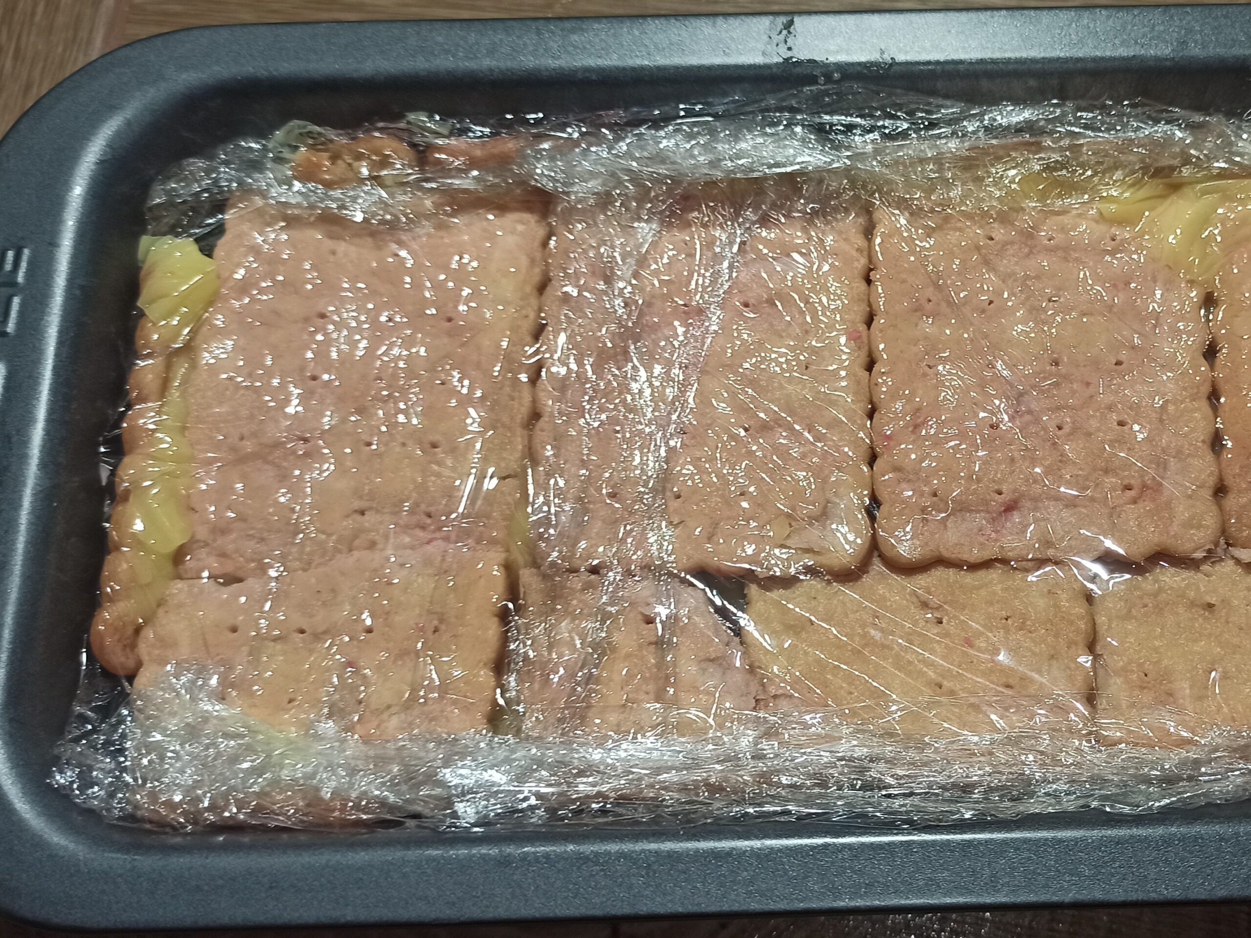 In una ciotola mettete lo zucchero, l’acqua e il liquore alchermes, le quantità variano a secondo i vostri gusti. Bagnate velocemente i biscotti, e foderate lo stampo.