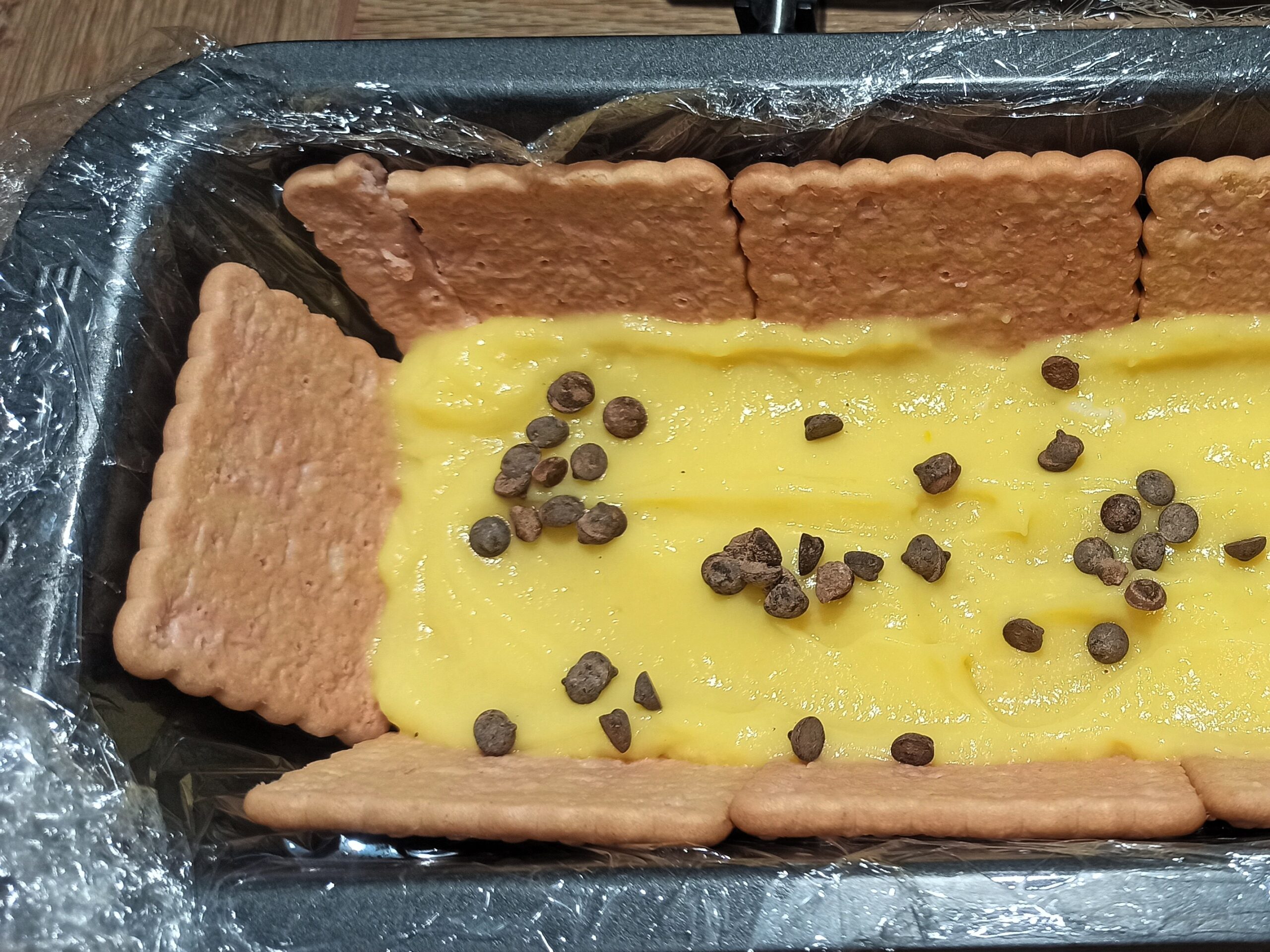 Sul fondo mettete una dose generosa di crema pasticcera, poi aggiungete le gocce di cioccolato.