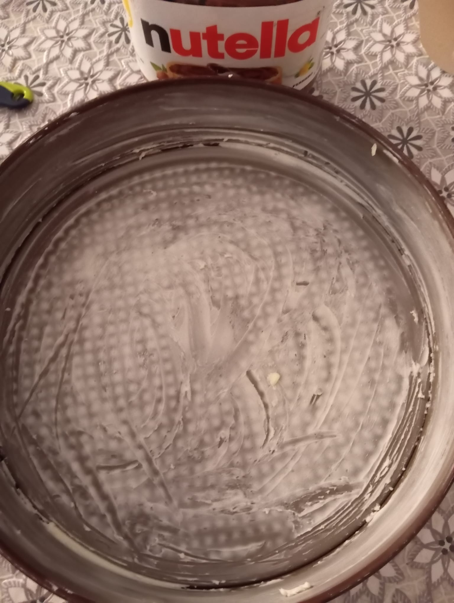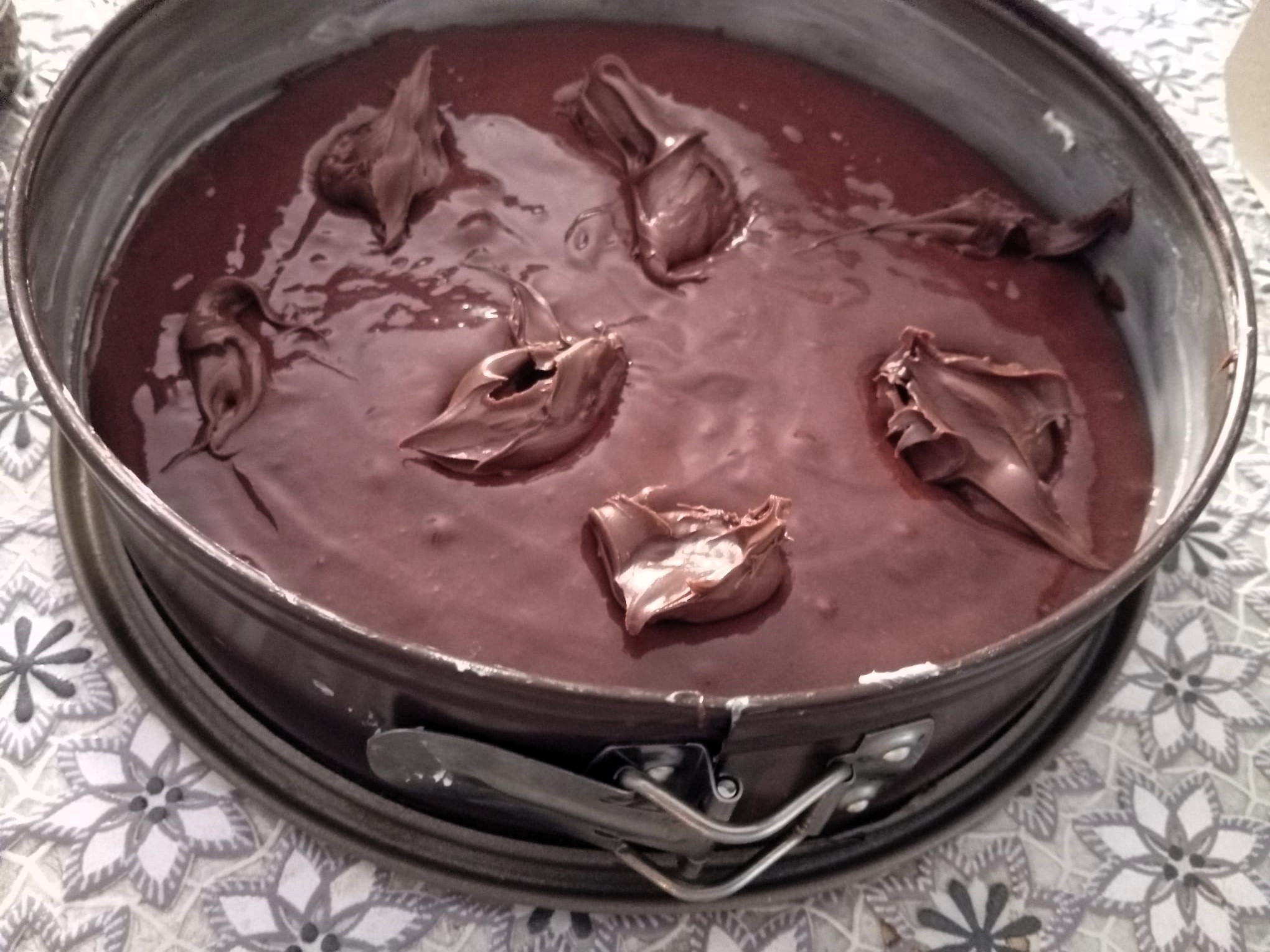 versate all’interno il composto ottenuto. Livellate con l’aiuto di una spatola, distribuite in superficie la nutella, con generose cucchiaiate.