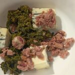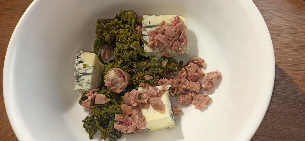 Per preparare la torta Pasqualotta, mettete in una ciotolina, la salsiccia sbriciolata, il gorgonzola ed i friarielli.