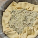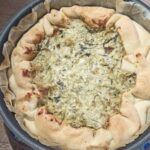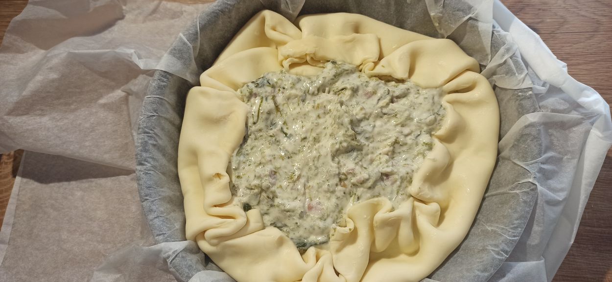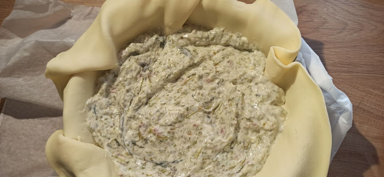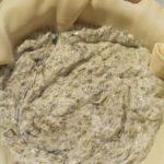 Amalgamate il tutto fino ad ottenere un composto omogeneo. Foderate una tortiera con la pasta brisè, senza eliminare la carta forno. Riempitela con il ripieno, livellate con l’aiuto di una spatola,