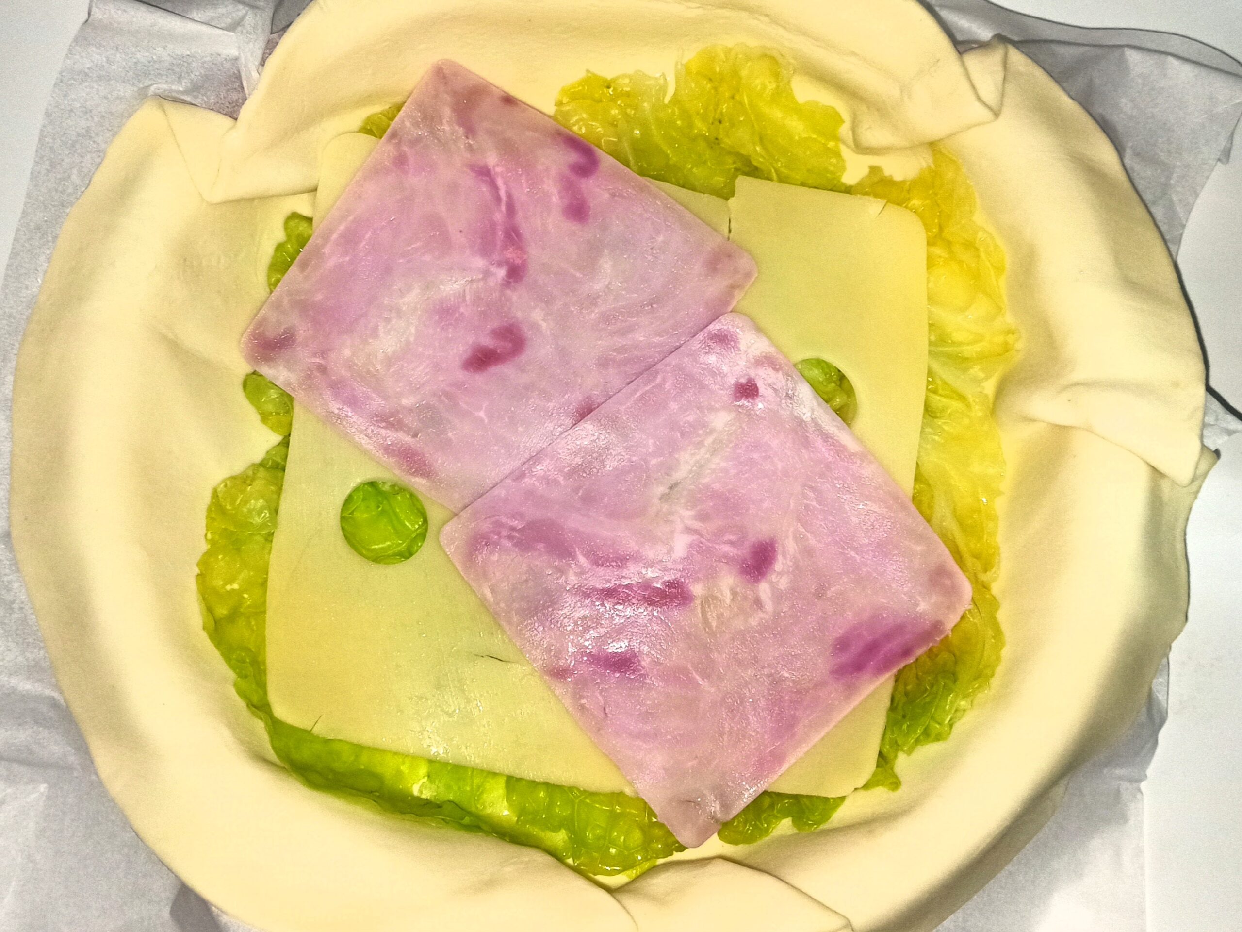 Ripetete la stessa sequenza per tre volte, richiudete i bordi, guarnite con altro formaggio e prosciutto.