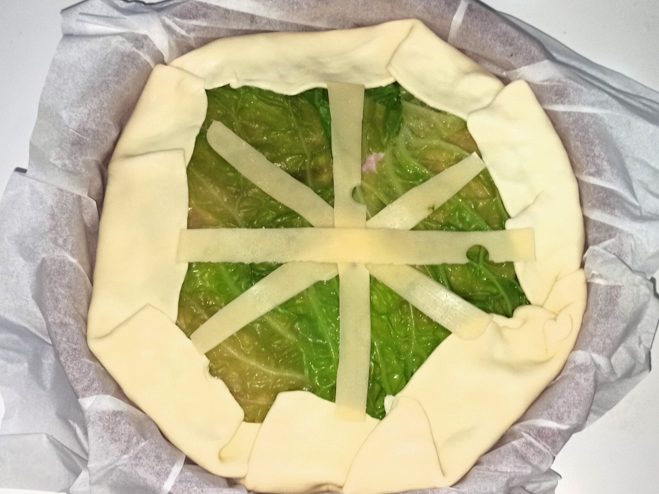 Posizionate la pasta sfoglia in uno stampo circolare, senza eliminare la carta forno, nella quale è avvolta. Ricoprite il fondo con le foglie di verza, poi le fette di emmenthal e poi il prosciutto cotto.