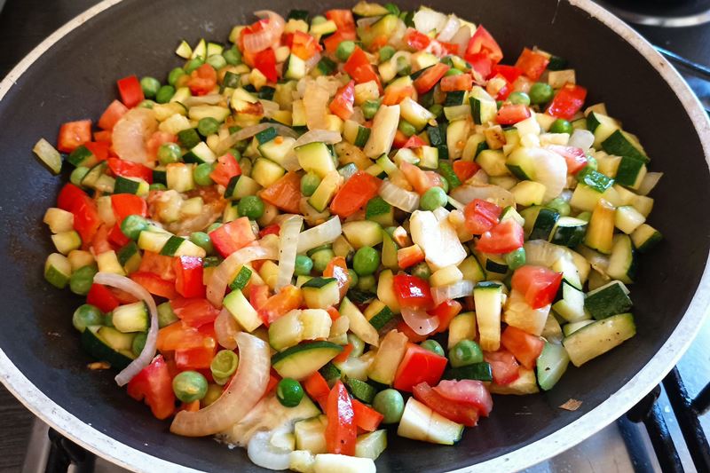 Versate in una capiente padella l’olio e fate rosolare l’aglio, versate tutte le verdure e fatele saltare in padella per insaporirle, girando con un cucchiaio di legno, e portandole a cottura;