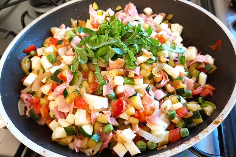 Tagliate la scamorza a cubetti, spezzettate il prosciutto cotto rimasto, e versateli nella padella con le verdure ormai fredde, mescolando gli ingredienti;