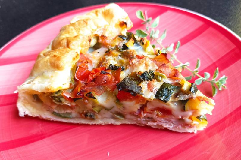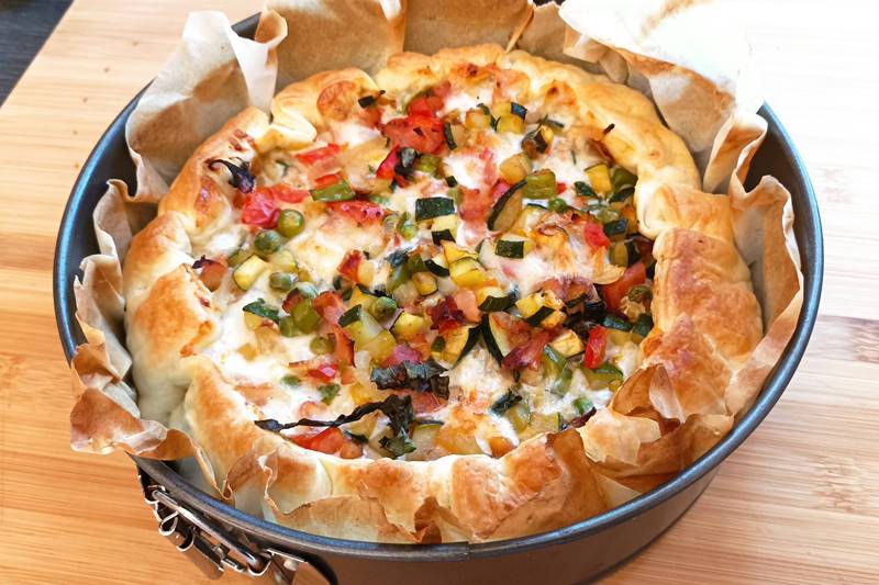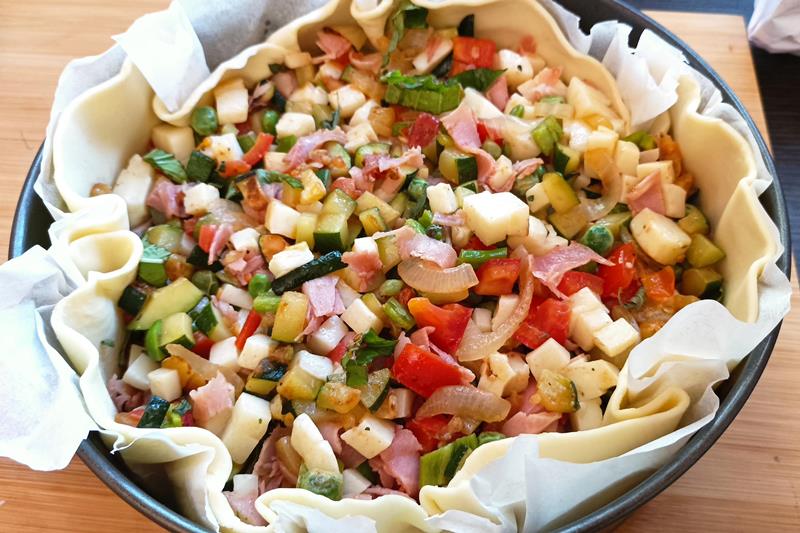 La Torta salata con verdure miste di stagione, senza uova, ideale per portare in tavola un arcobaleno di colori: un guscio fragrante che racchiude un mix perfetto di verdure, formaggio, prosciutto ed aromi;