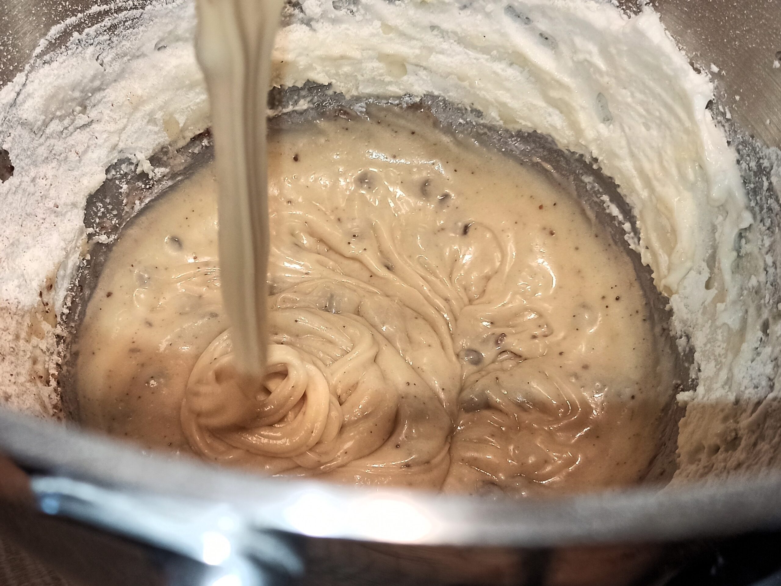 poi poco alla volta aggiungete le polveri, mescolando delicatamente con una spatola, alternate con l’olio ed il latte, ed infine le gocce di cioccolato. Mescolate bene fino ad ottenere un composto omogeneo.