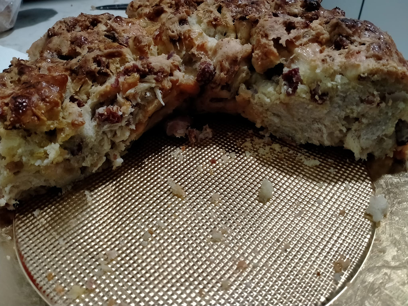 Il Tortano stracciato è una variante natalizia e sfiziosa del classico tortano napoletano. Si tratta di una ciambella di pane ripiena, ricca di sapore e perfetta per un pasto rustico o una merenda golosa. La versione “stracciata” si distingue per l’impasto più morbido e una preparazione che esalta la farcitura. A Napoli questo tipo di tortano si prepara generalmente per il pranzo del 24 dicembre, per “apparare” lo stomaco prima dell’abbuffata del cenone della Vigilia.
