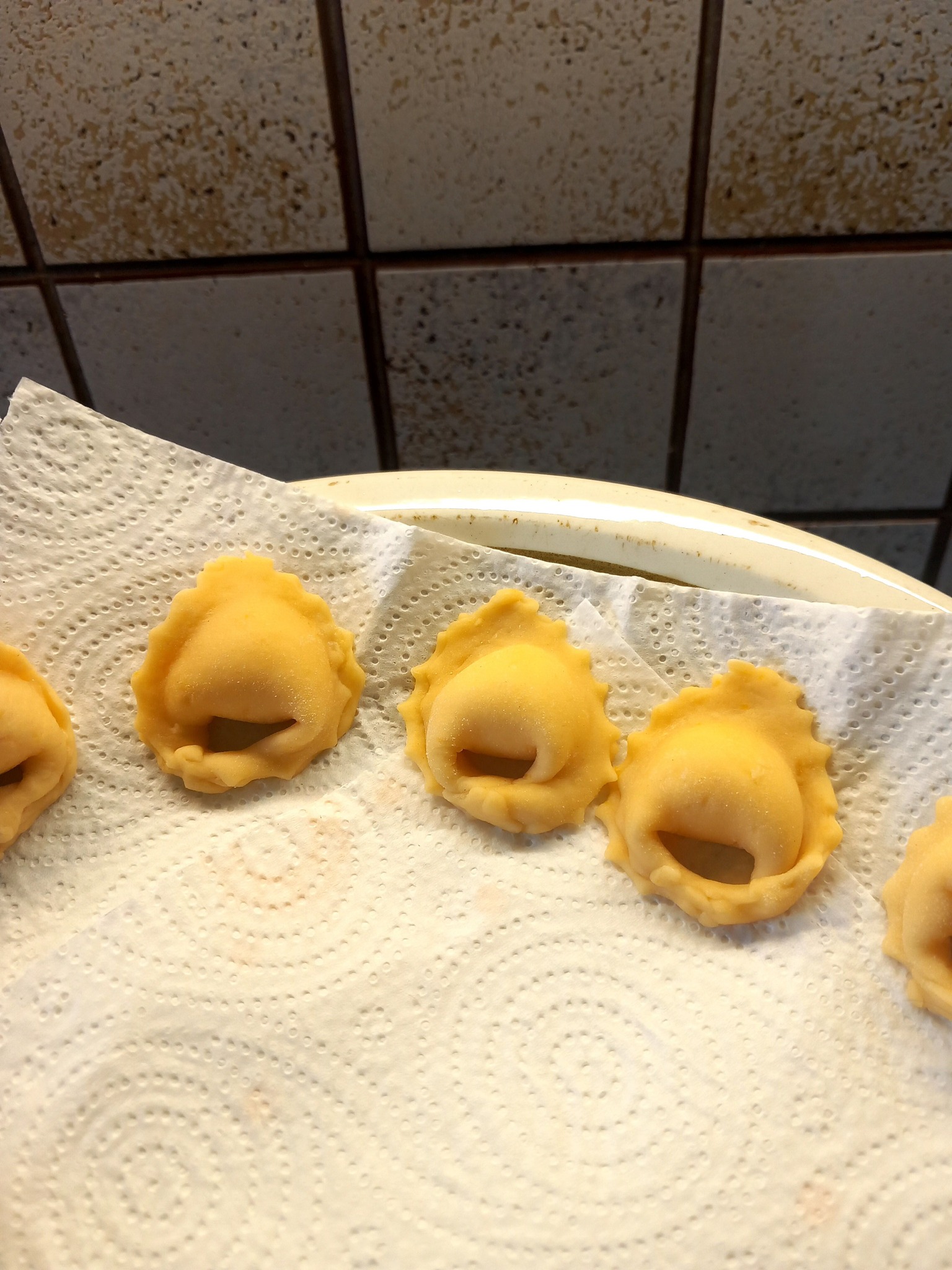 Ritagliamo dei quadrati di circa 7 cm per lato e adagiamo al centro di ognuno un cucchiaino di crema pasticcera. Possiamo aiutarci con un cucchiaino o con una sac à poche per essere più precisi. Chiudiamo i tortelli piegando la sfoglia a triangolo e sigilliamo bene i bordi. Uniamo poi i due angoli alla base con una leggera pressione per dare la tipica forma del tortellone.