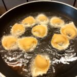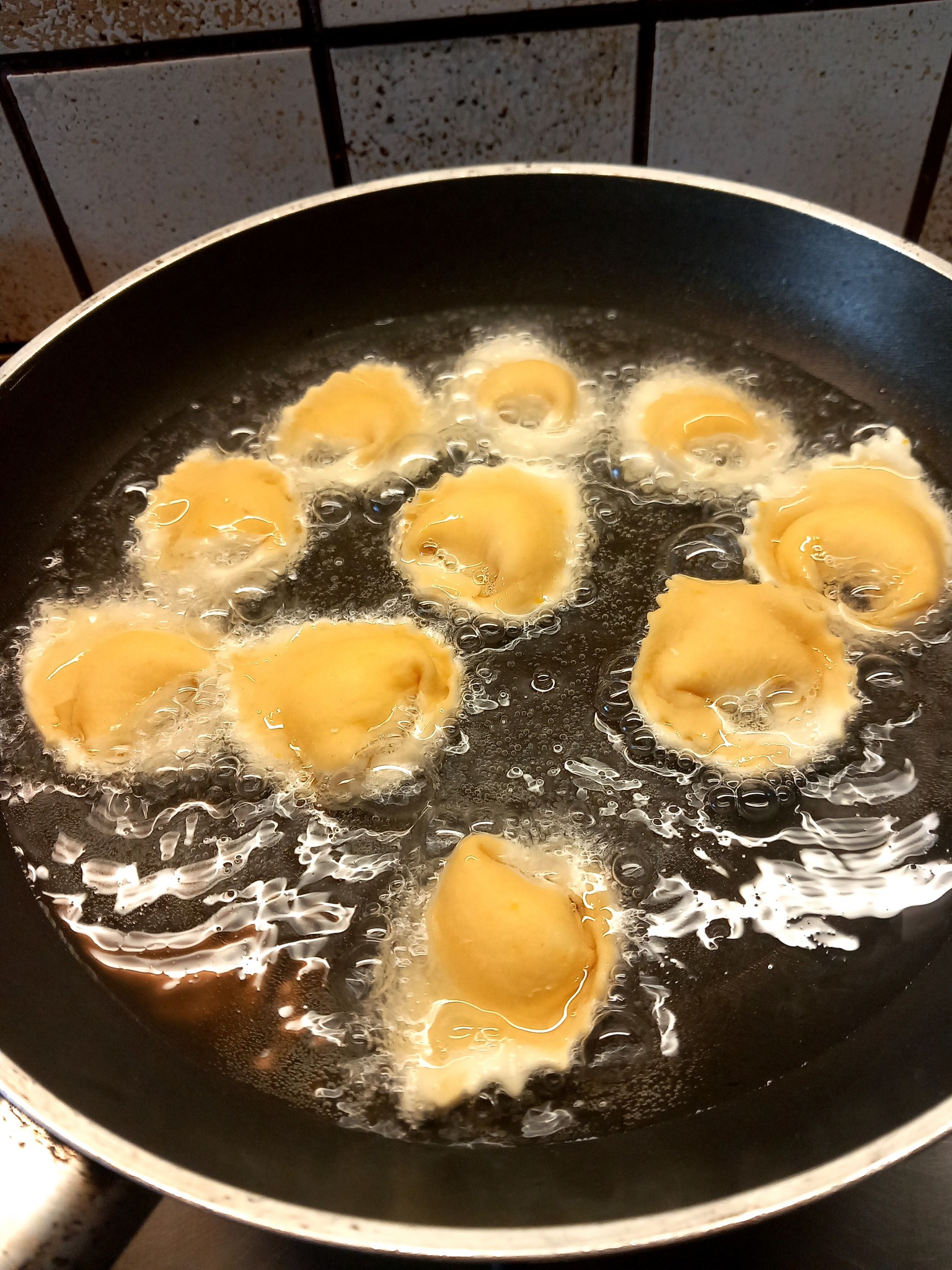 Scaldiamo abbondante olio di semi di girasole fino a raggiungere una temperatura di 170°C. Friggiamo pochi tortelli alla volta, girandoli delicatamente, fino a quando saranno dorati in modo uniforme.