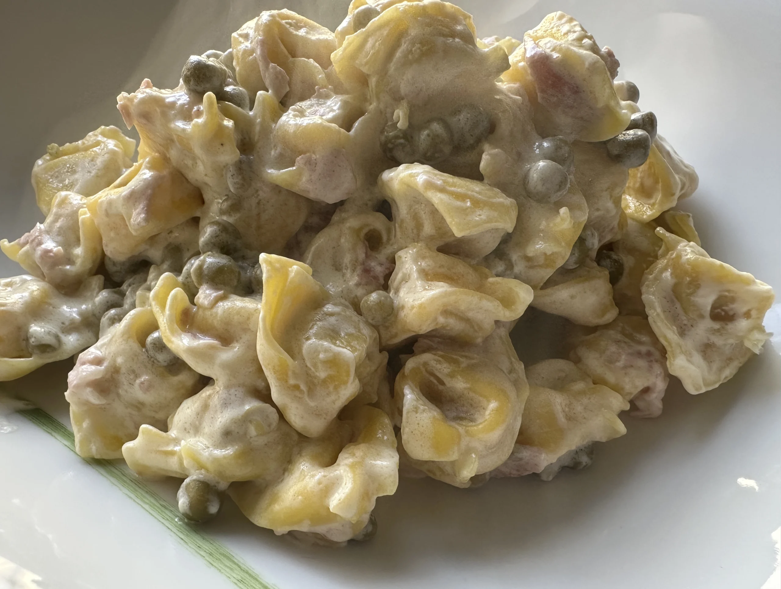 Porta a ebollizione una pentola di acqua salata e cuoci i tortellini seguendo i tempi indicati (di solito 2-3 minuti per quelli freschi). Scola i tortellini direttamente nella padella con la panna, piselli e prosciutto. Mescola delicatamente a fuoco basso per 1 minuto, in modo che si amalgamino bene.